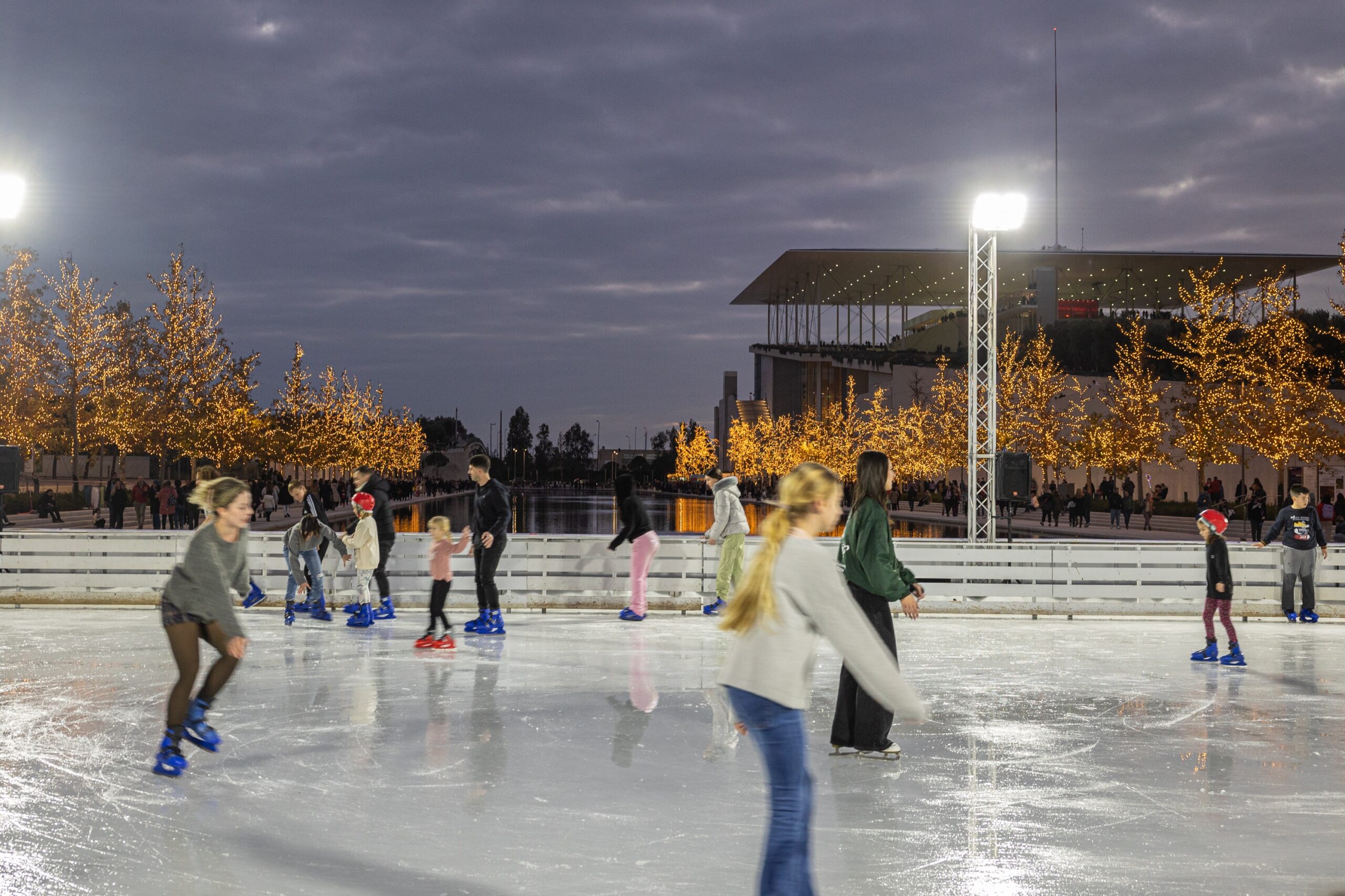 Οι επισκέπτες βρίσκουν το Παγοδρόμιο, όπως πάντα, στη βόρεια όχθη του Καναλιού, όπου, πέρα από το πατινάζ, μπορούν να απολαύσουν το φωτισμένο υπερθέαμα του ΚΠΙΣΝ και τα Χορογραφημένα Σιντριβάνια, καθώς στροβιλίζονται με τα παγοπέδιλά τους.
