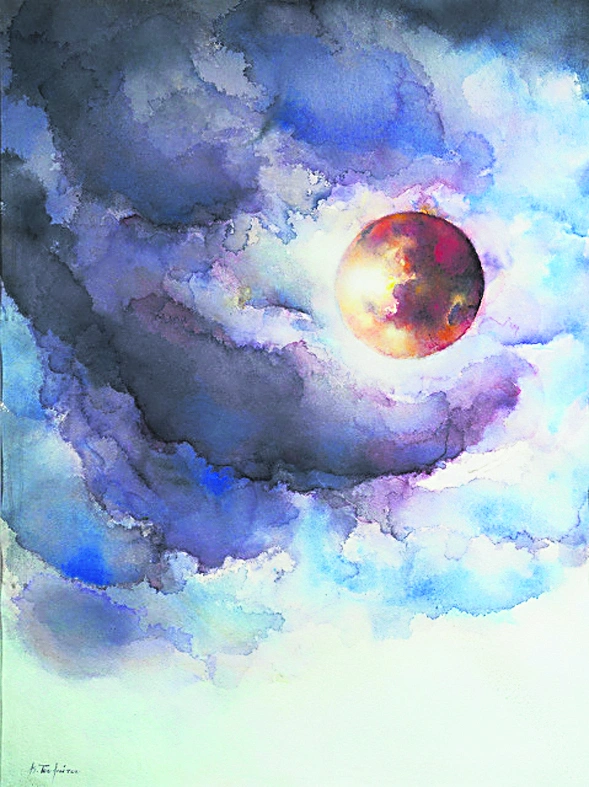 Ναι, βέβαια, ξεκινώ από μία ιδέα, ένα στοιχείο, τα σύννεφα στην προκειμένη περίπτωση, και στη συνέχεια προσθέτω άλλα στοιχεία, που εμπλουτίζουν και εξελίσσουν το έργο. Συνήθως η μία ιδέα γεννά την επόμενη, που πρέπει να αποτυπωθεί «εμμονικά». Ετσι, δημιουργούνται ενότητες έργων, που ολοκληρώνουν την αρχική εικόνα. Εδώ οι γυναικείες μορφές και η Σελήνη, που προέκυψαν στη συνέχεια, συνδέονται άμεσα, αφού η θεά Σελήνη σε θεολογικό και συμβολικό επίπεδο αποτελεί τη θηλυκή αρχή της δημιουργίας του κόσμου, καθώς και την πόρτα προς την απόκρυφη φύση της ανθρωπότητας και του Σύμπαντος, προς εκείνο που παραμένει άφατο στη συνηθισμένη θέαση της φύσης…