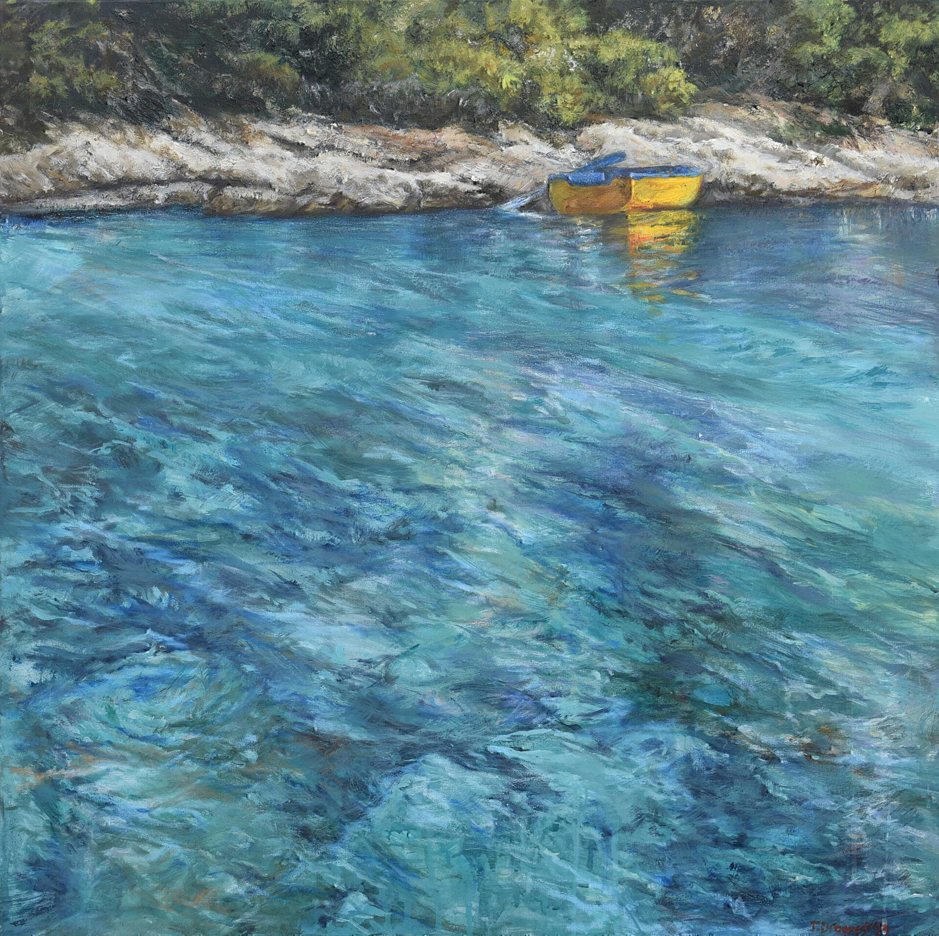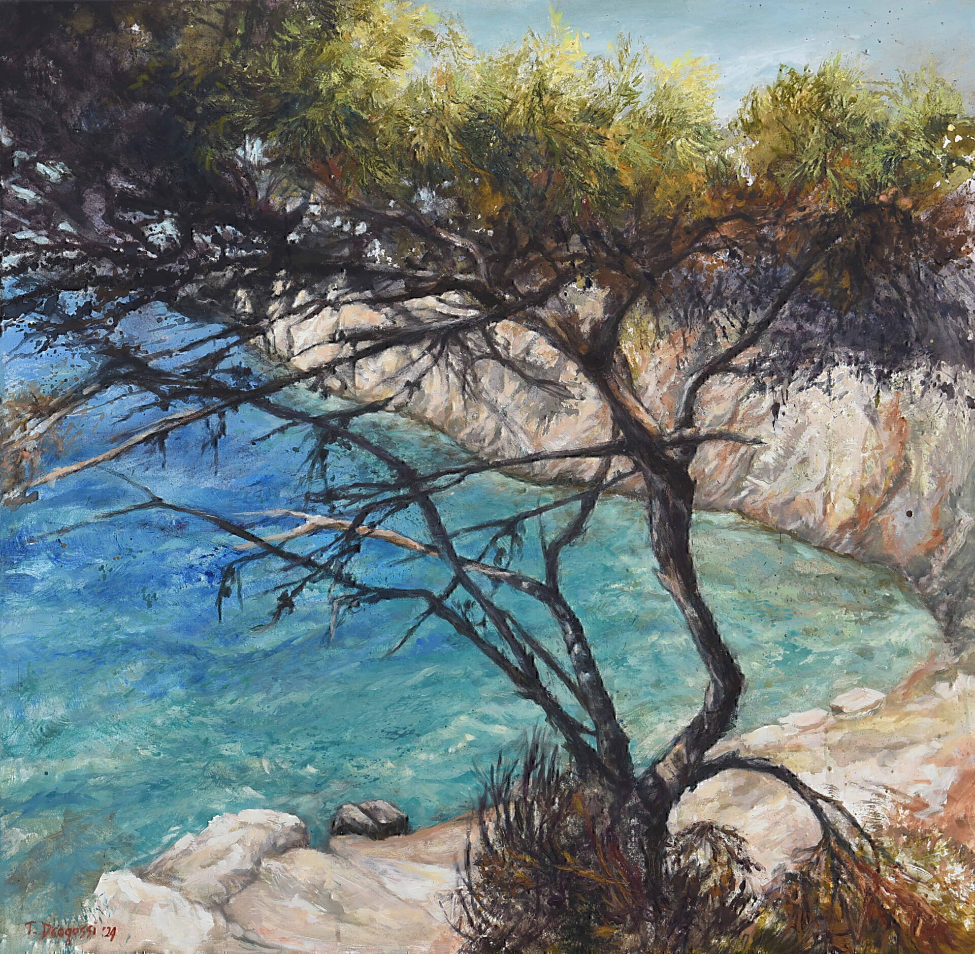 Η Τάνια Δρογώση ανιστορεί το νησί με τοπιογραφικές αναφορές βιωμένων τόπων. Χρησιμοποιεί σημεία του νησιού ως μοντέλα αλλά συνθέτει τις δικές της εικόνες με σαγηνευτικές παραλίες, απόκρημνους βράχους, παρθένες ακρογιαλιές και ενίοτε τα εμπλουτίζει με ανθρώπινη παρουσία. Η γραφή της κυριαρχείται από μια έκδηλη παραστατικότητα με αισθητές ιμπρεσιονιστικές αναφορές».