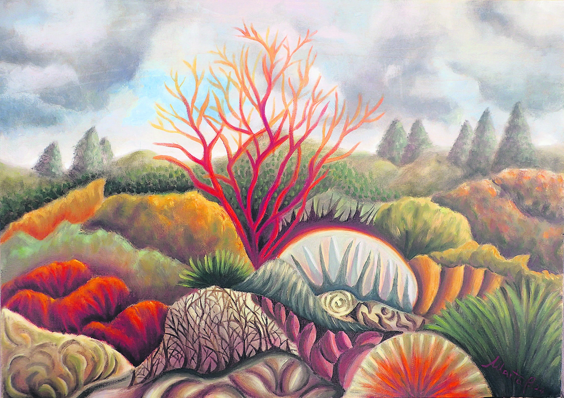 Νιώθω τη δύναμη της ενέργειας που μου μεταδίδει η γη, αναδύοντας αρχέτυπα στοιχεία, που εμφανίζονται αυθόρμητα, λυτρωτικά και μαγικά στη διάρκεια της ζωγραφικής εξέλιξής μου.