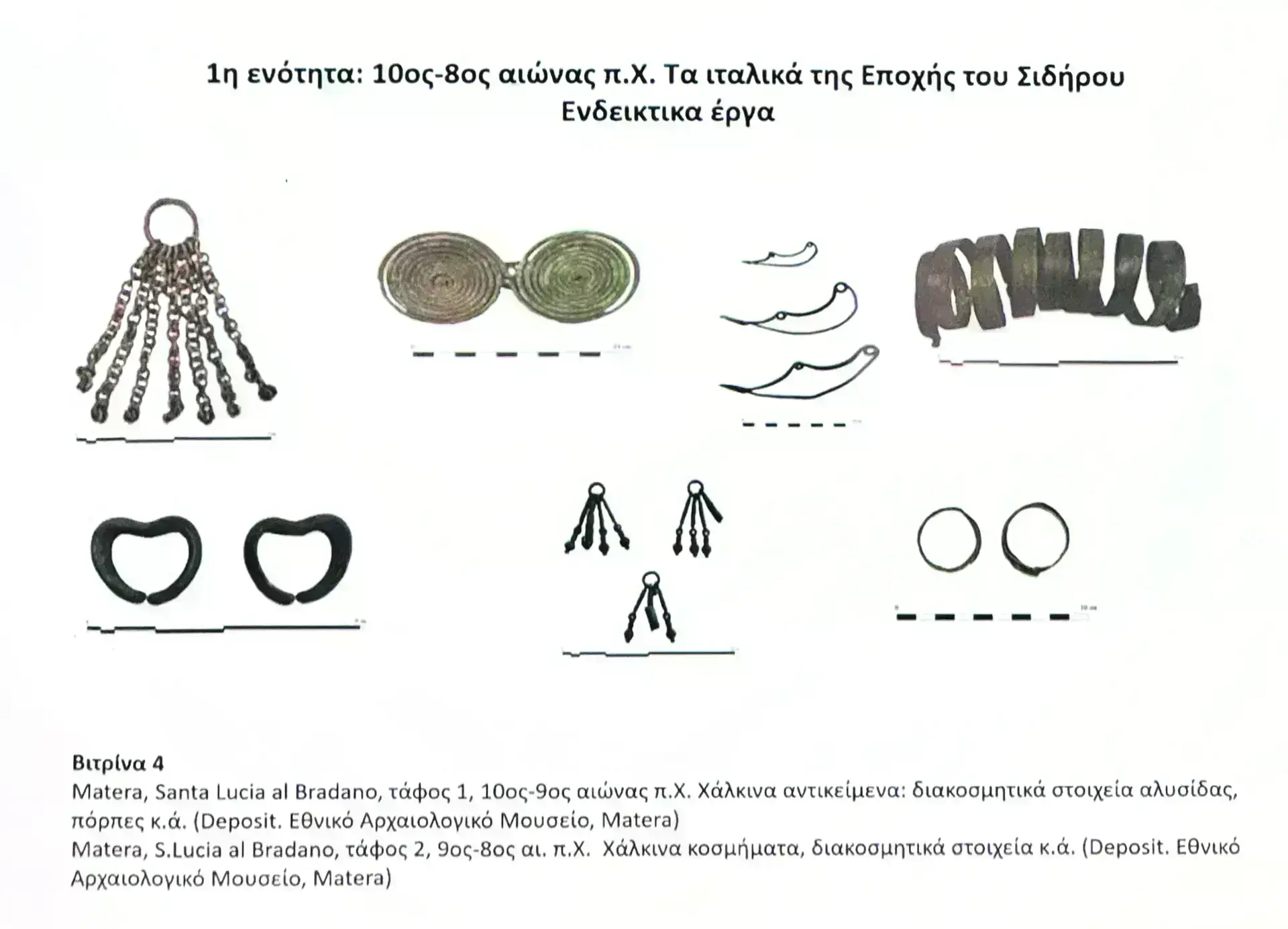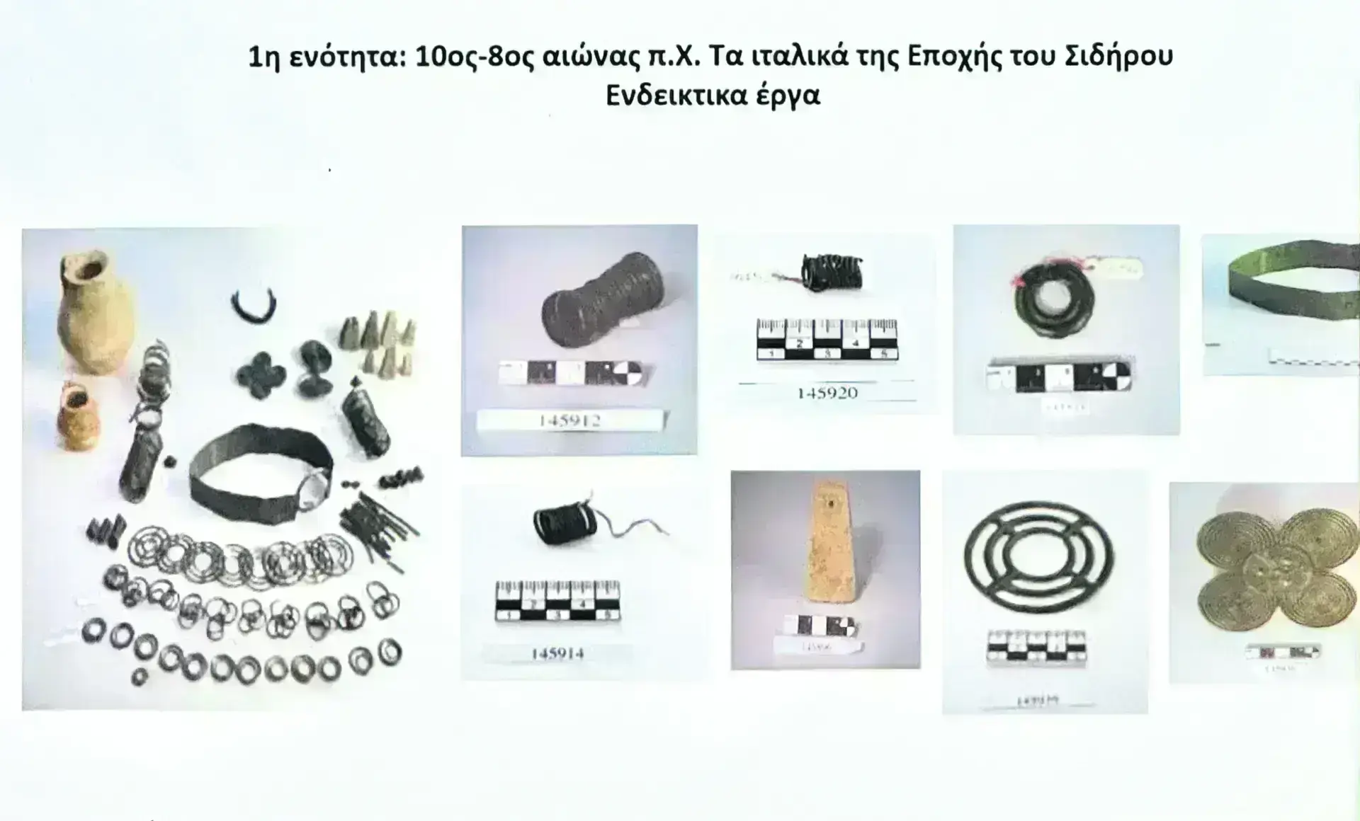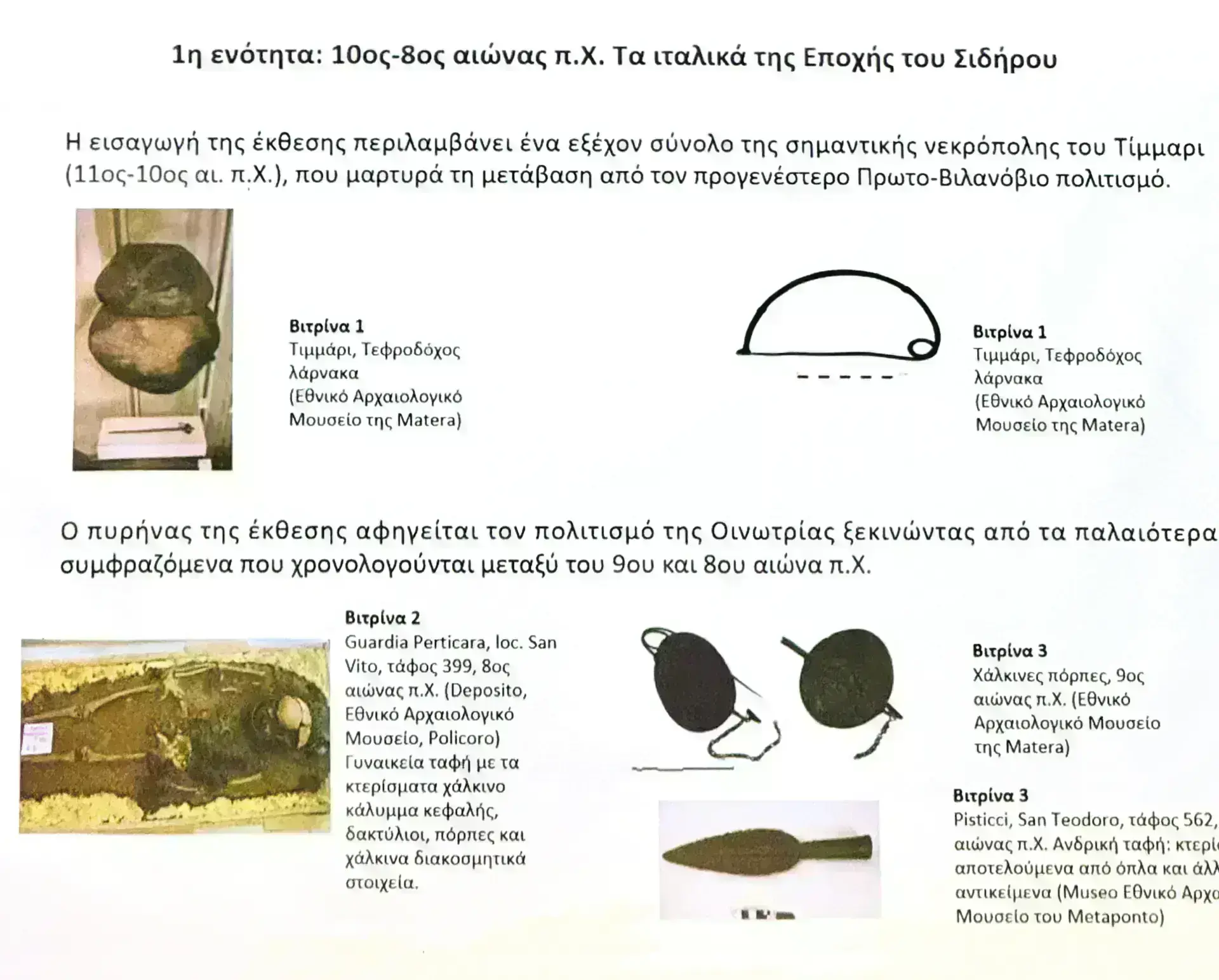 Το ταξίδι ξεκινάει με την ενότητα: «10ος-8ος αιώνας π.Χ. Τα ιταλικά της Εποχής του Σιδήρου», όπου ένα σύνολο της σημαντικής νεκρόπολης του Τίμμαρι (11ος-10ος αι. π.Χ.) μας μαρτυρά τη μετάβαση από τον προγενέστερο πρωτο-βιλανόβιο πολιτισμό. Στη συνέχεια ο πυρήνας της έκθεσης αφηγείται τον πολιτισμό της Οινωτρίας κατά τον 9ο και 8ο αιώνα π.Χ. και μας οδηγεί στην 2η ενότητα με την πολιτιστική εξέλιξη που αντιπροσωπεύουν τα κτερίσματα «του 7ου αιώνα π.Χ. Τα ιταλικά της αρχαϊκής περιόδου».