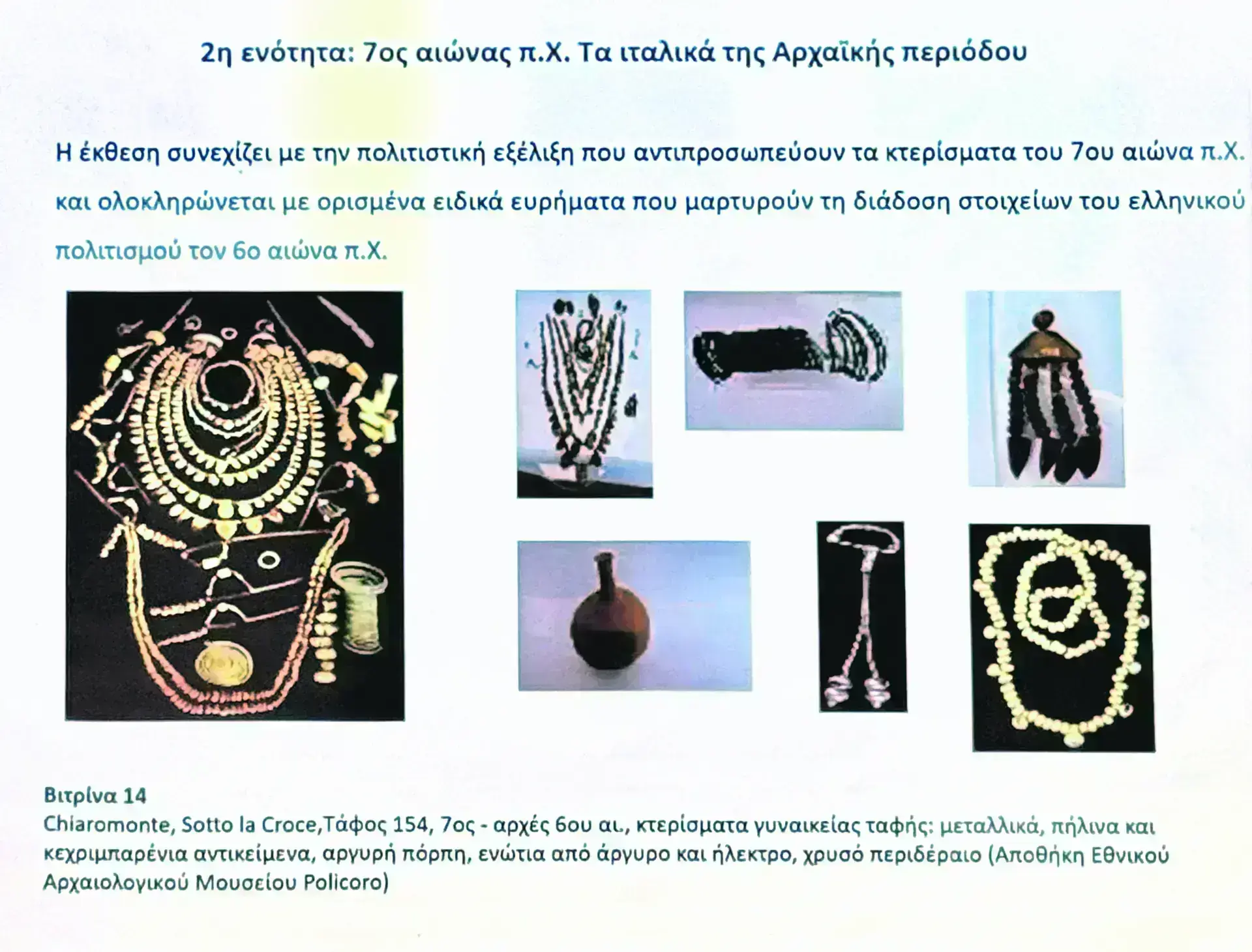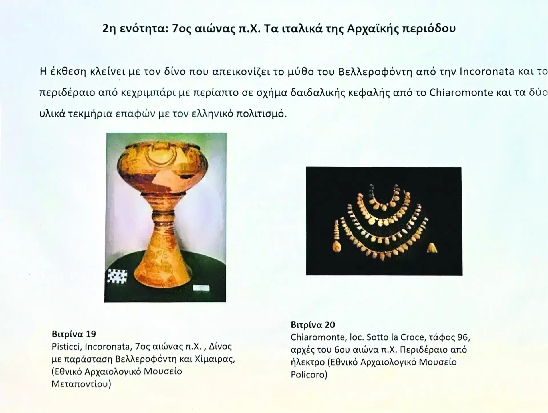 Στην έκθεση επίσης θα παρουσιαστούν ορισμένα ειδικά ευρήματα που μαρτυρούν τη διάδοση στοιχείων του ελληνικού πολιτισμού τον 6ο αιώνα π.Χ. Το ταξίδι στην Οινωτρία ολοκληρώνεται με δύο εξαιρετικά σημαντικά τεκμήρια επαφών με τον ελληνικό πολιτισμό: τον δίνο, το κεραμικό αγγείο, που απεικονίζει το μύθο του Βελλεροφόντη και της Χίμαιρας από την περιοχή Incoronata και το πανέμορφο περιδέραιο από κεχριμπάρι με περίαπτο σε σχήμα δαιδαλικής κεφαλής από το Chiaromonte του 6ου αιώνα π.Χ.