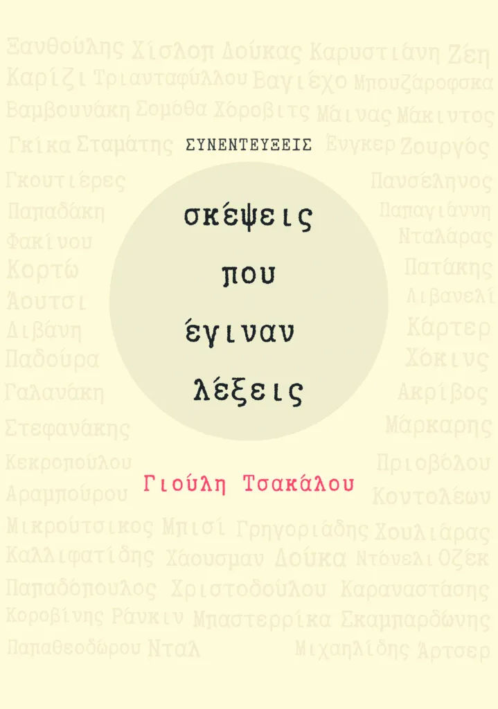 Περιλαμβάνονται εξήντα πέντε συνεντεύξεις σε μία ενιαία έκδοση από κείμενα της Γιούλης Τσακάλου που δημοσιεύθηκαν στον «Ελεύθερο Τύπο», στην «Athens Voice», στο Diastixo.gr και στο «Fractal». Μεταξύ των προσωπικοτήτων που της παραχώρησαν συνέντευξη, είναι η Πρόεδρος της Δημοκρατίας, Κατερίνα Σακελλαροπούλου, ο πρωθυπουργός, Κυριάκος Μητσοτάκης, ο γενικός γραμματέας της Κ.Ε. του ΚΚΕ, Δημήτρης Κουτσούμπας, ο διοικητής της Τραπέζης της Ελλάδος, Γιάννης Στουρνάρας, και ακολουθεί ένας μακρύς κατάλογος από ανθρώπους του πνεύματος, όπως οι παγκοσμίου φήμης συγγραφείς Ντονάτο Καρίζι, Χοσέ Κάρλος Σομόθα, Λεονάρδο Παδούρα, Φερνάντο Αραμπούρου και τόσοι άλλοι.