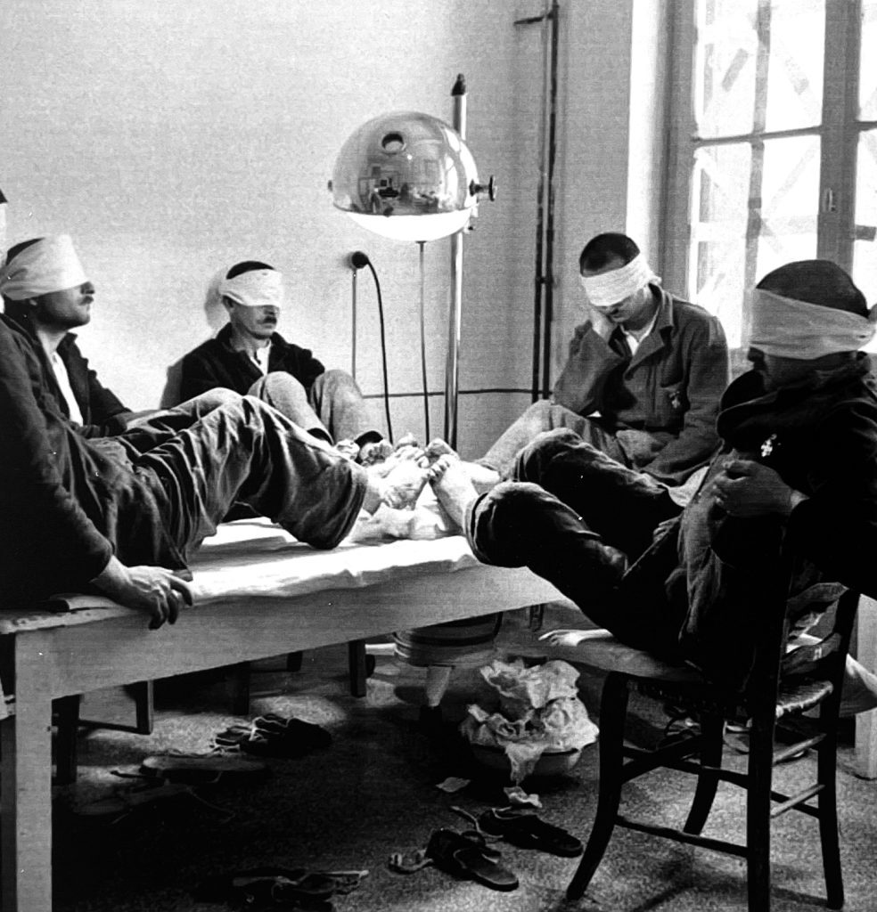 Ανάμεσα στο φωτογραφικό αρχείο συναντάμε ένα ντοκουμέντο με ένα από τα πιο στυγερά γεγονότα της εποχής… Ηταν 12 Απριλίου του ’40 όταν οι Γερμανοί τορπίλισαν το πλωτό νοσοκομείο Αττική το οποίο έπλεε με τα διακριτικά του Ερυθρού Σταυρού μεταφέροντας τραυματίες από το Οχυρό Ρούπελ, αδελφές νοσοκόμες και γιατρούς. Κατευθυνόταν από την Καβάλα στον Πειραιά. Λίγα βήματα πιο κάτω συναντάμε στιγμιότυπα από την Αθήνα, τη Θεσσαλονίκη, τη Φλώρινα, το Αργυρόκαστρο, αλλά και από την απελευθέρωση των Ιωαννίνων από τους Γερμανούς. Την έκθεση εμπλουτίζουν επίσημες στολές εθελόντριας νοσηλεύτριας από το 1940. Ασπρόμαυρα ντοκουμέντα από τη διανομή ανθρωπιστικού υλικού από τον ΕΕΣ σε παραμεθόριο περιοχή της κατοχικής Ελλάδας μας μεταφέρουν στην εποχή εκείνη φωτίζοντας πρόσωπα-αφανείς ήρωες του ’40 που πολέμησαν για την απελευθέρωση της χώρας.