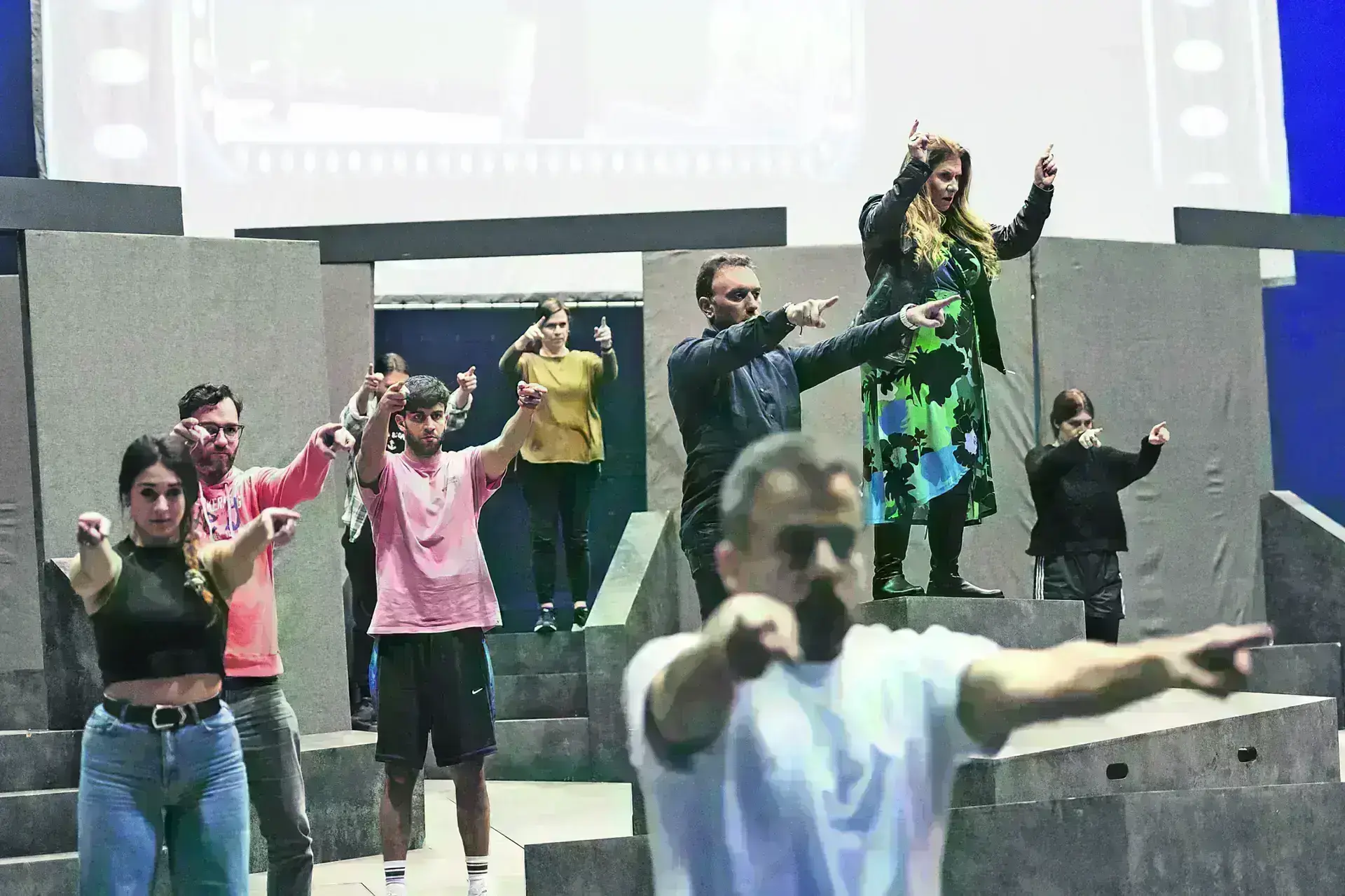 Διαχρονική. Υπάρχουν ταυτόχρονα η εποχή που γράφεται το έργο, η σημερινή και η αίσθηση μιας αδιευκρίνιστης μελλοντικής εποχής. Μια βασική πηγή έμπνευσης για τους συνεργάτες μου και εμένα ήταν το «Μετρόπολις» του Φριτς Λανγκ και η χρήση ζωντανού βίντεο μέσα σ’ ένα σκηνικό που συνεχώς μεταβάλλεται από τους περφόρμερ ενισχύει τη ρευστότητα τόσο της εποχής όσο και των εντυπώσεων που αποκομίζει ο θεατής. Κι αυτό -η συνεχής μεταβολή των δυναμικών μέσα από τις εγγενείς αντιφάσεις του συστήματος- ήταν πάντα ένα από τα βασικά ζητούμενα του επικού θεάτρου του Μπρεχτ.