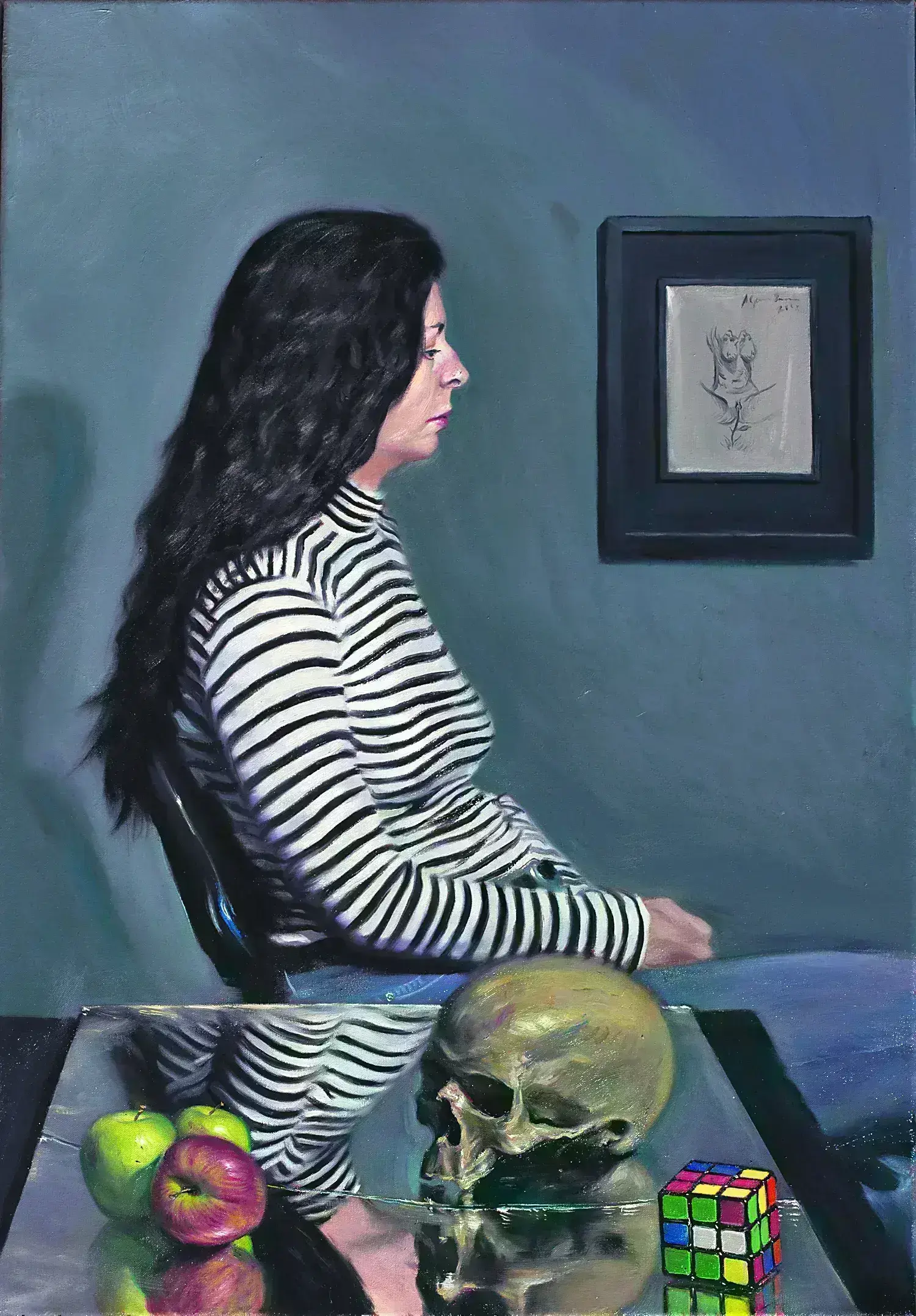 Σε αυτή την έκθεση παρουσιάζω έργα πιο κλασικά, ζωγραφικά και κάποια πιο σύνθετα, υπερρεαλιστικά. Πρόκειται για ένα σύνολο δουλειάς, το ένα μέρος της οποίας μεταφέρει την ανάγκη μου να αντιμετωπίσω τη ζωγραφική ως εικόνα, όπου προέχουν η φόρμα, το χρώμα, η κίνηση, αυτή η ίδια η ευχαρίστηση της ζωγραφικής. Το άλλο μέρος βασίζεται στις μελέτες, όπου εξωτερικεύω κάτι πιο προσωπικό, όπως για παράδειγμα είναι το έργο «Μητρικό» ή οι «Χρονοκάψουλες», όπου προσπαθώ ουσιαστικά να εγκλωβίσω τη φιγούρα σε έναν χώρο με πολλαπλούς συμβολισμούς. Αλλες φορές οι συμβολισμοί έχουν να κάνουν με το χώρο και το χρόνο και άλλες φορές είναι περισσότερο οπτικοί. Για παράδειγμα, αντικαθιστώ τα στήθη της γυναίκας με δύο ποτήρια γάλα και τη μήτρα με ένα αβγό.