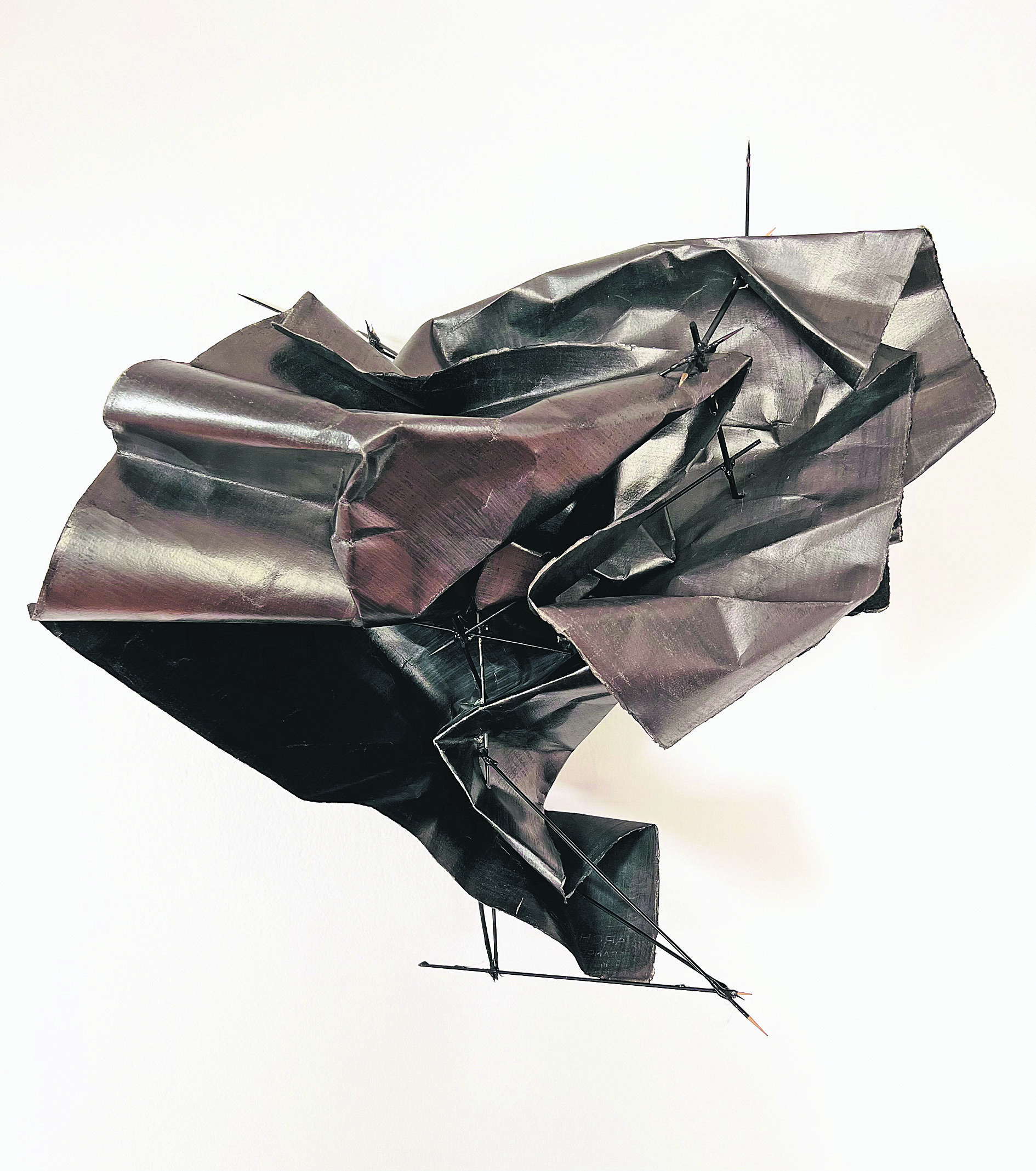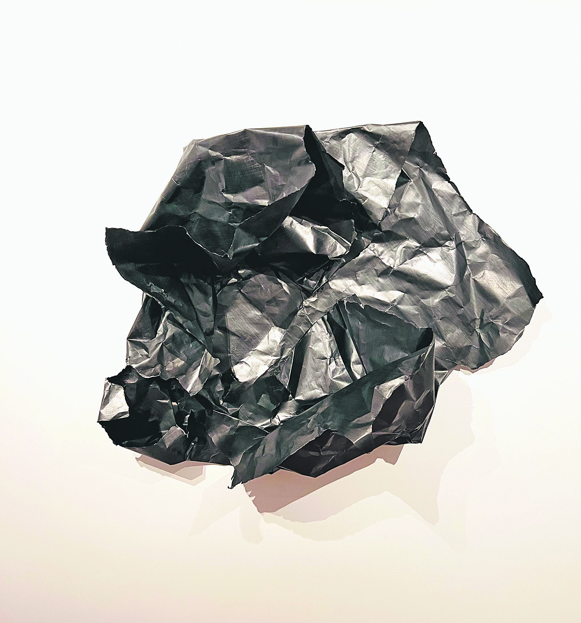 «Η δουλειά μου εν γένει είναι ενδιάμεσοι χώροι μεταξύ δύο και τριών διαστάσεων», λέει στον «Ε.Τ.» της Κυριακής ο Πάνος Φαμέλης, καθώς περιδιαβαίνουμε ανάμεσα στα έργα του στην γκαλερί Citronne. «Μπορεί να κάνω ζωγραφική και αυτή να μεταπλάθεται στη συνέχεια σε γλυπτό. Στην προκειμένη περίπτωση, έχω πάρει λευκά χαρτιά, τα έχω γράψει με πάρα πολλές στρώσεις από γραφίτη και μολύβι, απλά τα μαύρισα δηλαδή και εκεί συνειδητοποίησα πως όσο γράφω μαύρο, η επιφάνεια τελικά γυαλίζει. Αυτό είναι μια πιο βαθιά φιλοσοφική προσέγγιση που έχει να κάνει με την ίδια τη ζωή. Οσον αφορά στα γλυπτά, πήρα λευκό χαρτί, το μαύρισα μπρος-πίσω και απλά το τσαλάκωσα, δίνοντάς του διάφορες μορφές, ώστε να δημιουργήσω το γλυπτό. Ηθελα να κάνω ό,τι πιο απλό μπορούσα, μέσα από μια όσο το δυνατόν πιο συμπυκνωμένη ενέργεια και διαδικασία. Ουσιαστικά, αυτό που κάνω είναι πολύ απλό. Στην υπέρβασή του γίνεται η αλλαγή».