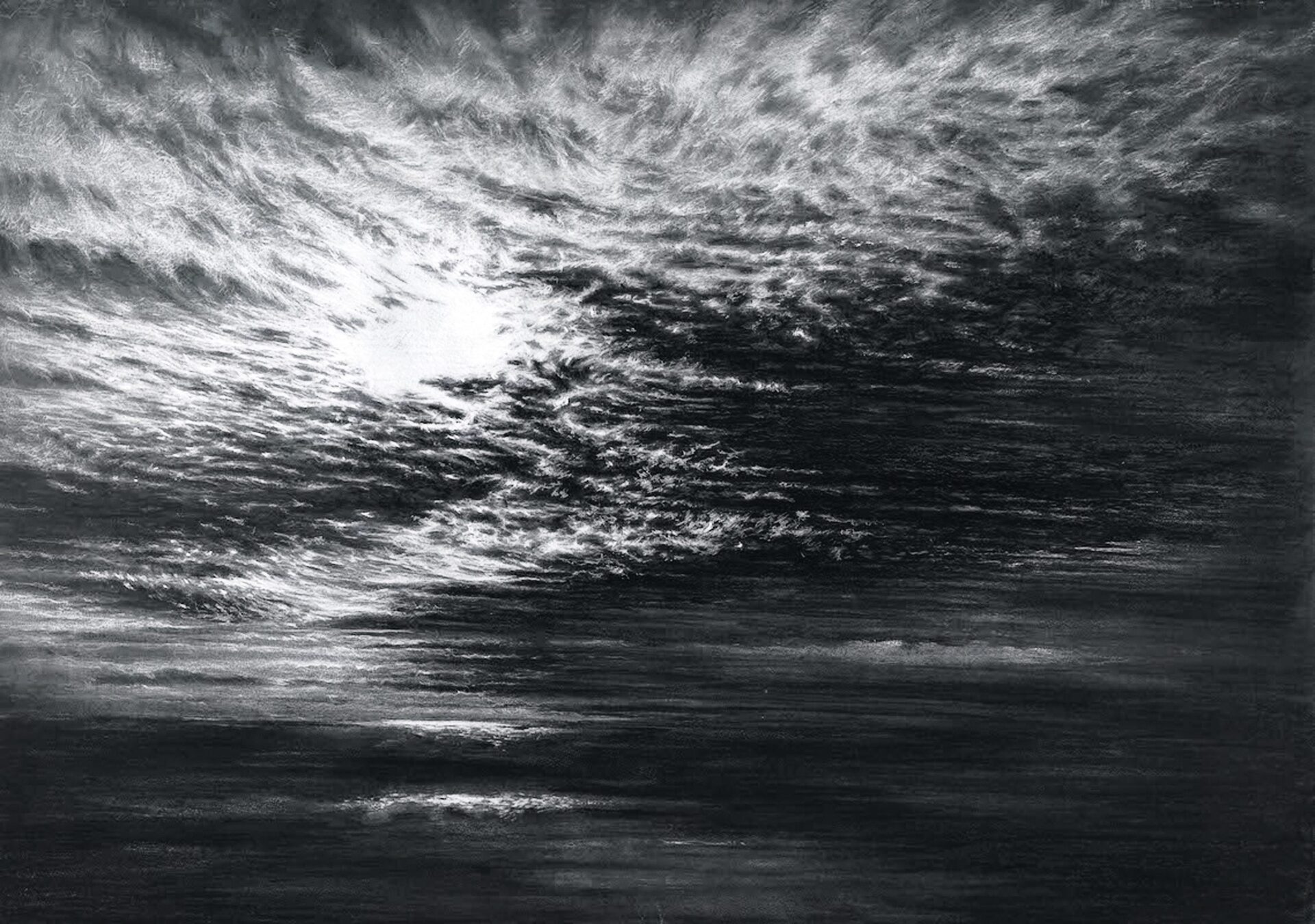 Για την ακρίβεια βλέπετε αναπαραστάσεις ουρανογραφιών, οριζόντων. Είναι φόρμες αφηρημένες. Είναι η πρώτη φορά που κάνω έκθεση με παράσταση. Με ενδιαφέρει η αφαίρεση. Τα σύννεφα για εμένα είναι αφαιρετικές φόρμες και μια ευθεία ο ορίζοντας. Γεννιέται μια πολύ βαθιά σχέση μεταξύ παράστασης και αφαίρεσης, μεταξύ χρόνου και χώρου. Ουσιαστικά, στην ενότητα αυτή αποτυπώνονται άχρονες και άχρωμες στιγμές, οι οποίες είναι, δυνάμει, ημέρα και νύχτα μαζί, όταν το ορατό φως προέρχεται ταυτοχρόνως από τον ήλιο και από τη σελήνη. Υπάρχουν στιγμές όπου το φως γίνεται σκοτάδι και αντιστρόφως. Πλάθεται μια συνολική «απόκοσμη» εικόνα, ανάμεσα σε έναν ρεαλιστικό και έναν υπερβατικό κόσμο.