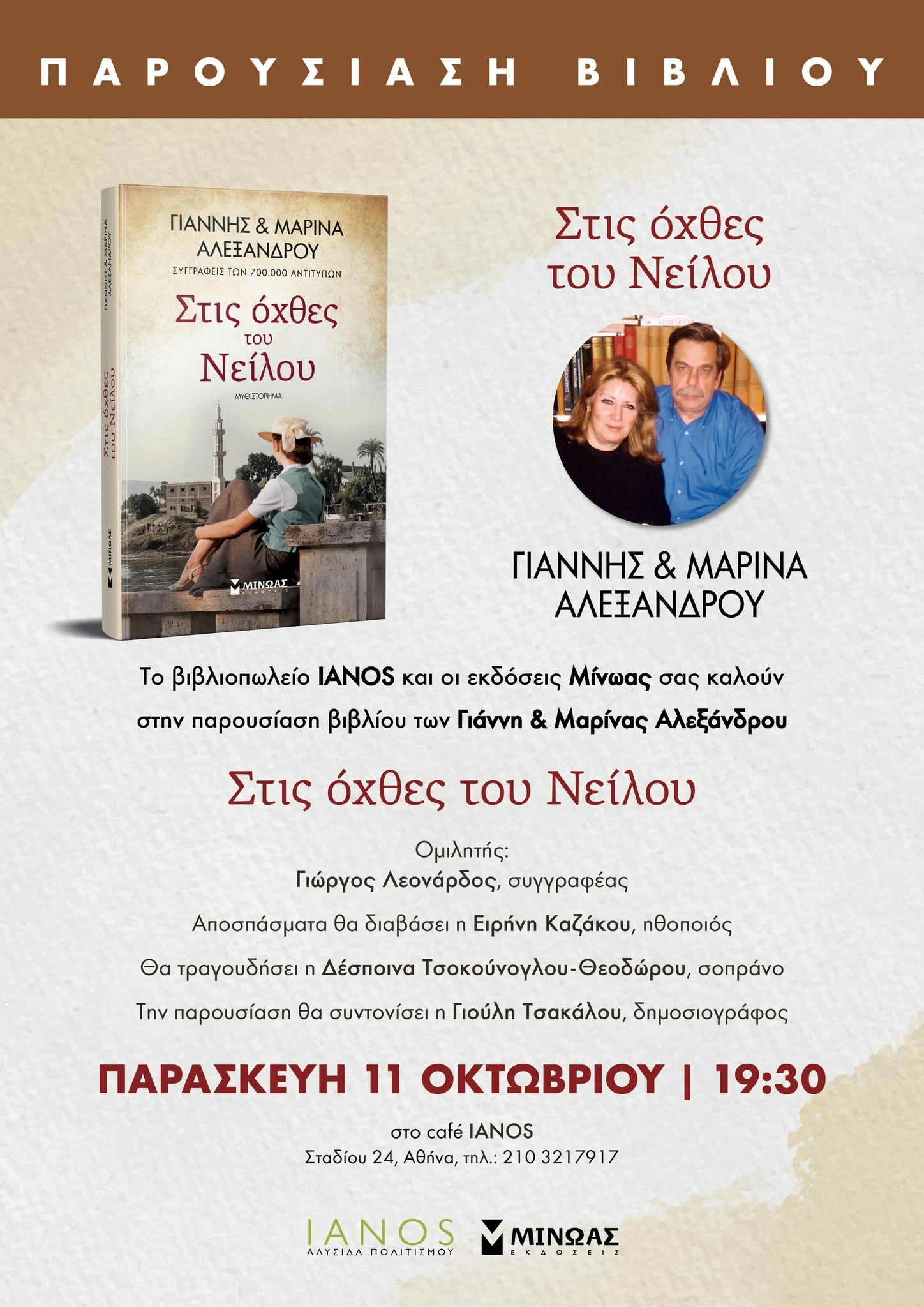 Την Παρασκευή 11 Οκτωβρίου, στις 19:30 η Αλυσίδα Πολιτισμού Ιανός και οι εκδόσεις Μίνωας διοργανώνουν παρουσίαση του νέου βιβλίου των Γιάννη & Μαρίνας Αλεξάνδρου, με τίτλο “Στις όχθες του Νείλου”.