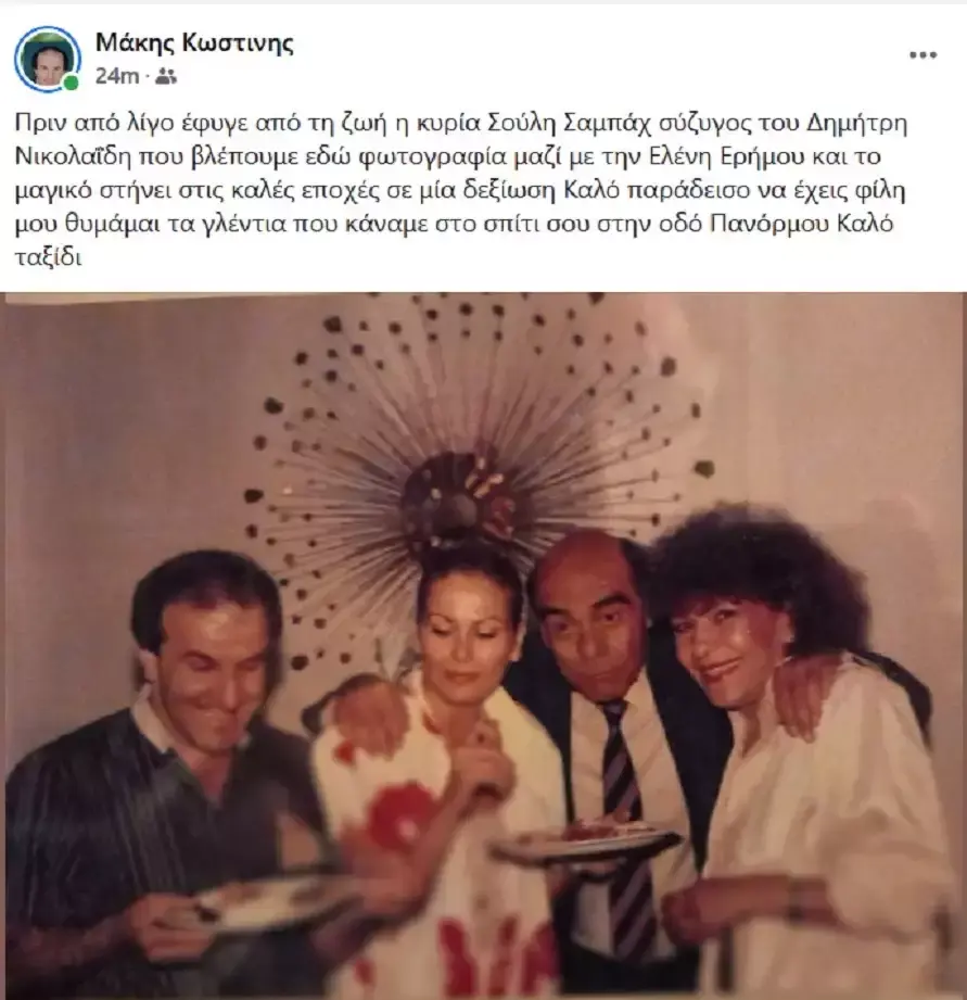 «Πριν από λίγο έφυγε από τη ζωή η κυρία Σούλη Σαμπάχ σύζυγος του Δημήτρη Νικολαΐδη που βλέπουμε εδώ φωτογραφία μαζί με την Ελένη Ερήμου και το μαγικό στήνει στις καλές εποχές σε μία δεξίωση Καλό παράδεισο να έχεις φίλη μου θυμάμαι τα γλέντια που κάναμε στο σπίτι σου στην οδό Πανόρμου. Καλό ταξίδι», έγραψε σε ποστ του δημοσιεύοντας κοινή τους φωτογραφία.