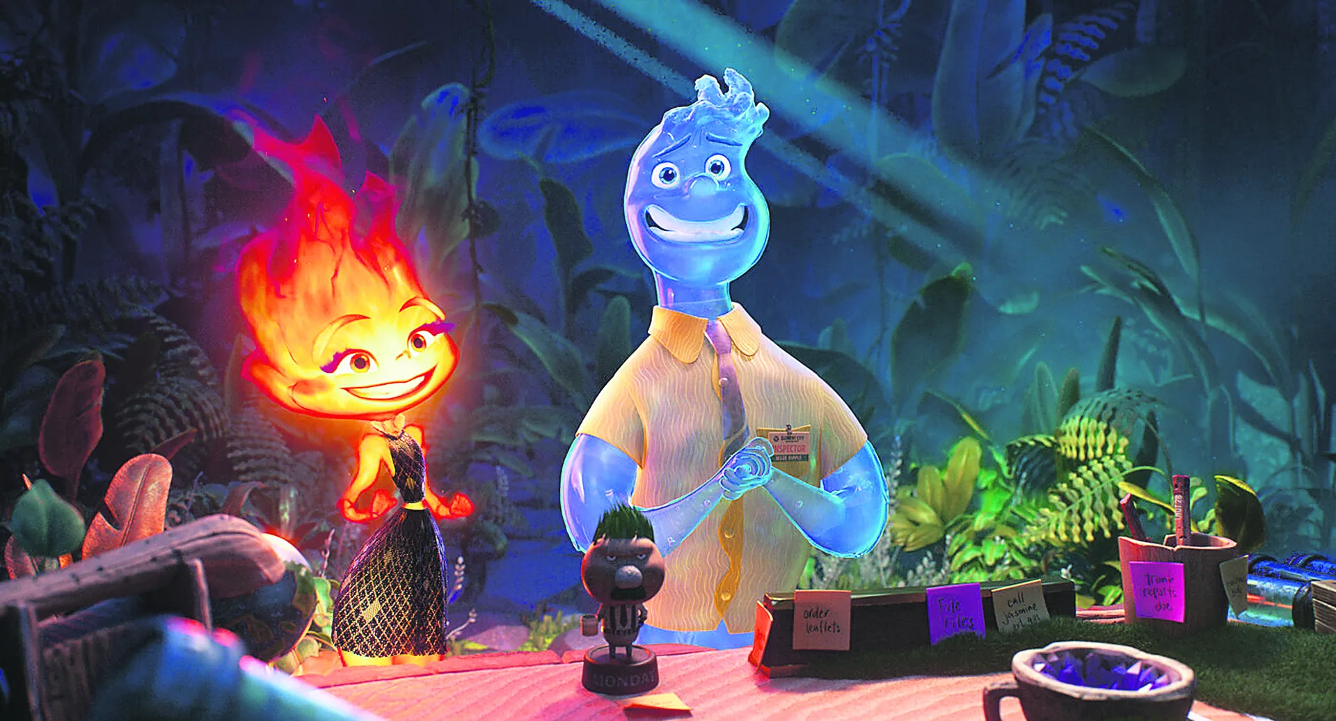 Στη νέα ταινία της Pixar μεταφερόμαστε στην πόλη Elemental, όπου τα τέσσερα στοιχεία της φύσης, φωτιά, νερό, αέρας και γη, έχουν καταφέρει να βρουν τρόπους να ζουν μαζί, παρά τις αντιθέσεις τους. Στο επίκεντρο της ιστορίας βρίσκονται δύο χαρακτήρες που από τη φύση τους έρχονται σε σύγκρουση. Ο Γουέιντ είναι φτιαγμένος από νερό και είναι ήσυχος, καλόβολος, «πάει με το ρεύμα» θα λέγαμε. Από την άλλη, η Εμπερ είναι φτιαγμένη από φωτιά, είναι δυναμική, ανήσυχη και ατρόμητη. Ομως, δεν μπορεί να κυκλοφορεί στην πόλη χωρίς να βλέπει τους άλλους κατοίκους να παραμερίζουν στο πέρασμά της. Ακόμα και η ίδια φοβάται να έρθει σε επαφή μαζί τους, καθώς ξέρει πολύ καλά ότι μπορεί να τους προκαλέσει κακό και αρκείται στις βόλτες στη δική της γειτονιά, υπακούοντας, άλλωστε, και στα λόγια της μητέρας της, που της θυμίζουν διαρκώς ότι «φωτιά και νερό δεν πάνε μαζί».