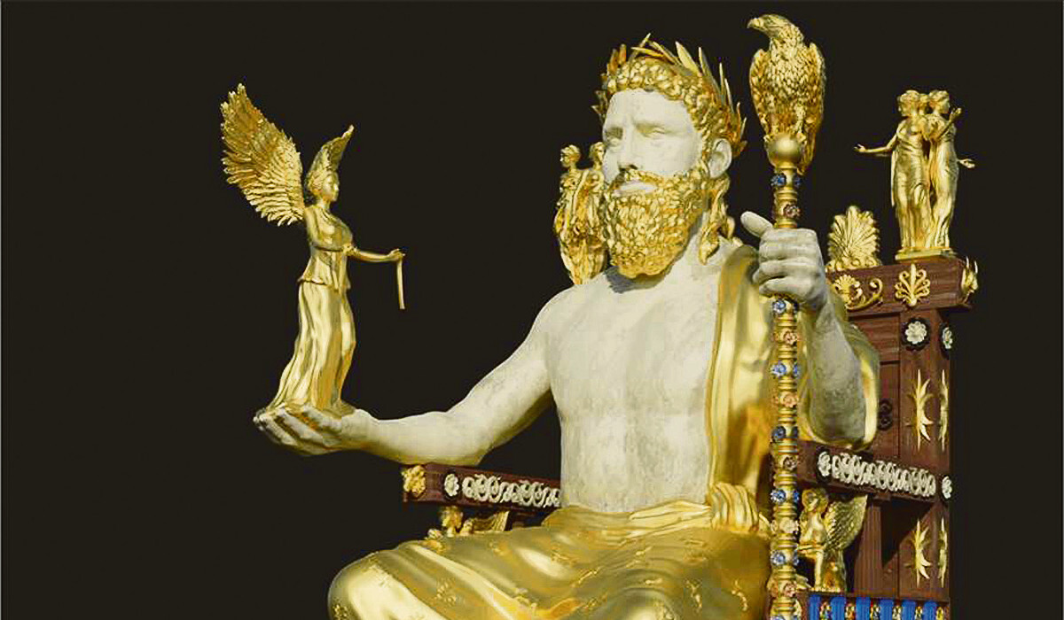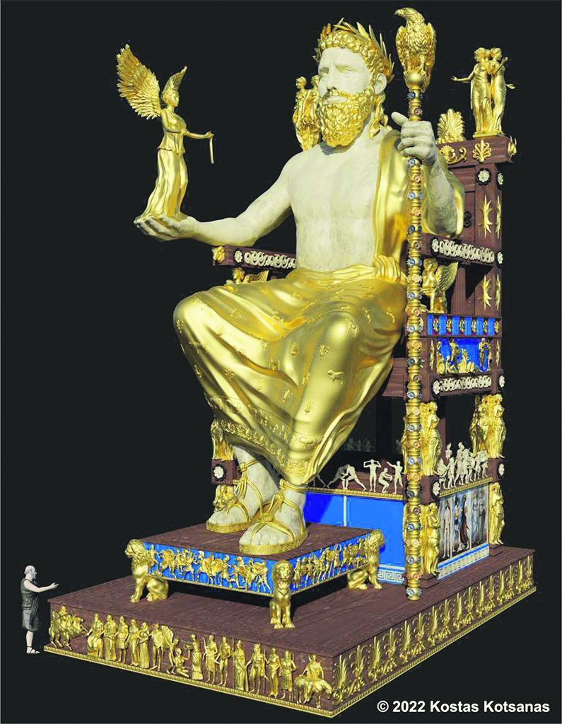 Το πιστό αντίγραφο του χρυσελεφάντινου αγάλματος του Δία «συνομιλεί» σήμερα με το αντίστοιχο αντίγραφο του «Κολοσσού της Ρόδου»! «Συγκεκριμένα η κατασκευή του χρυσελεφάντινου αγάλματος του Δία διήρκεσε 2,5 χρόνια και αποτελεί αξιόπιστο αντίγραφο του πρωτοτύπου, καθ’ ότι ακολουθεί πιστά όλες τις σωζόμενες πηγές», αναφέρει ο κ. Κοτσανάς. Και εξηγεί πως ο ένθρονος θεός αναπαρίσταται πιστά σύμφωνα με τα αρχαία νομίσματα της Ηλιδας που αποτυπώνουν ρεαλιστικά τη μορφή του, ενώ οι συνολικές και οι επιμέρους διαστάσεις του υπό κλίμακα 1:10 αντιστοιχούν με αυτές που διασώζει ο ποιητής Καλλίμαχος και συνάδουν με τα αρχαιολογικά ευρήματα της βάσης του.