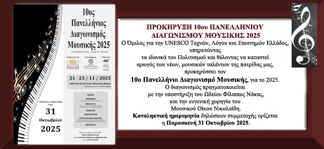 Ο Όμιλος για την UNESCO Τεχνών, Λόγου και Επιστημών Ελλάδος, υπηρετώντας τα ιδανικά του Πολιτισμού και θέλοντας να καταστεί αρωγός των νέων, μουσικών ταλέντων της πατρίδας μας, προκηρύσσει τον 10ο Πανελλήνιο Διαγωνισμό Μουσικής, για το 2025.
