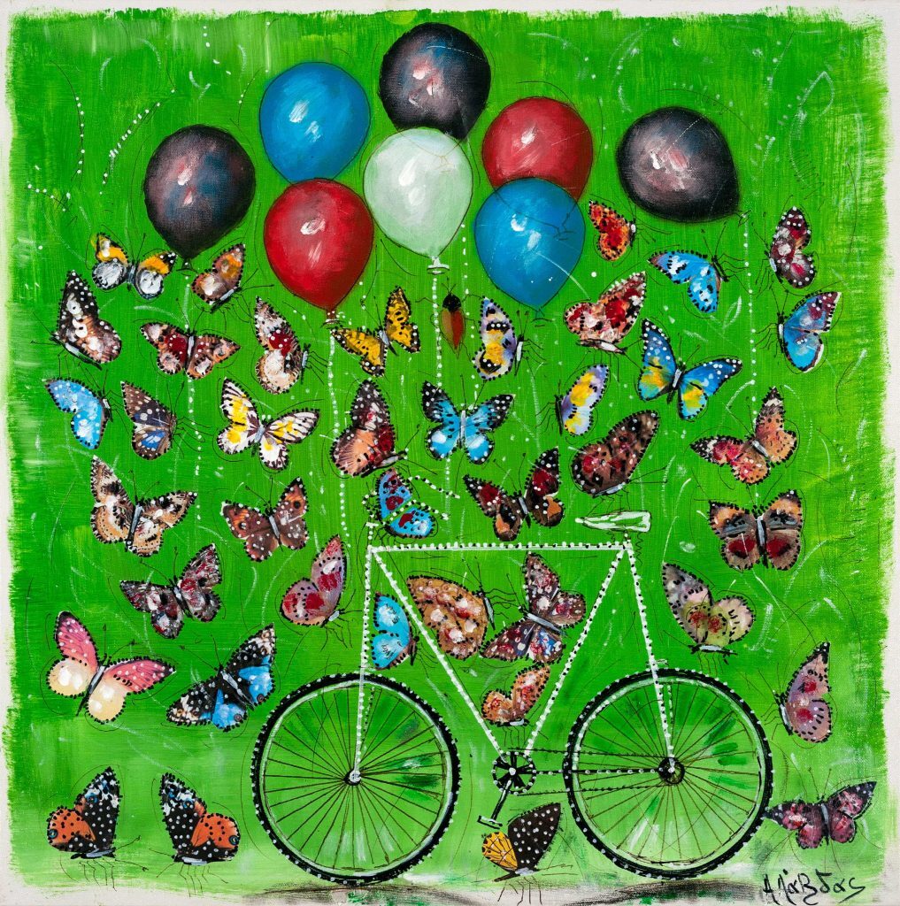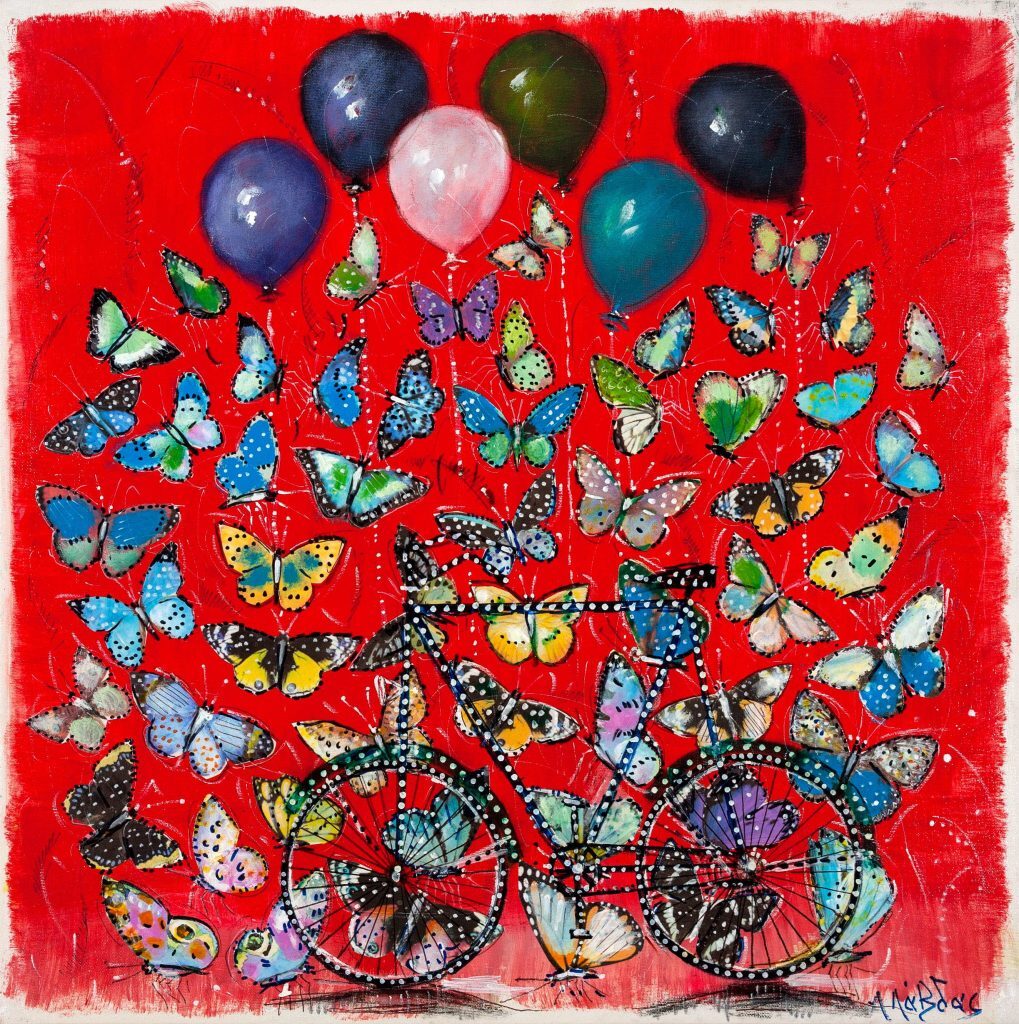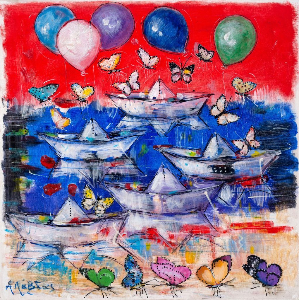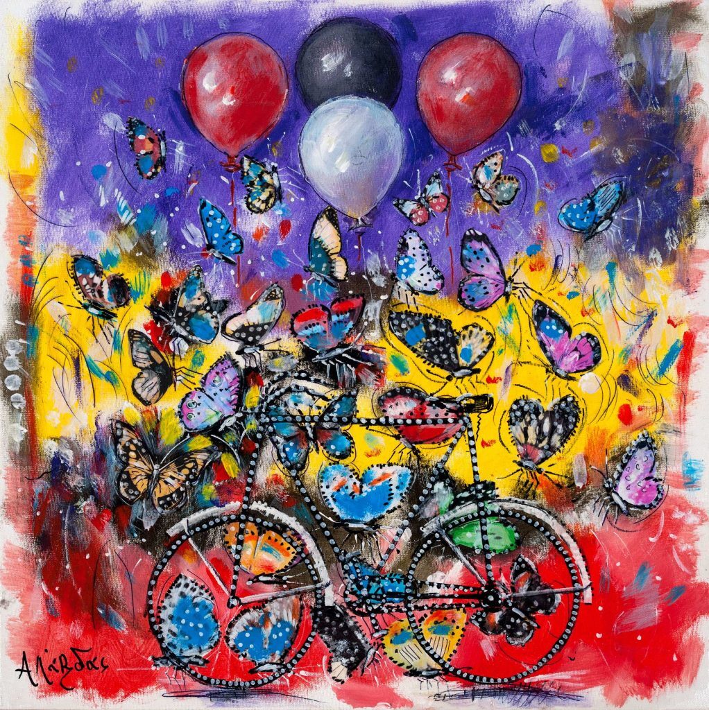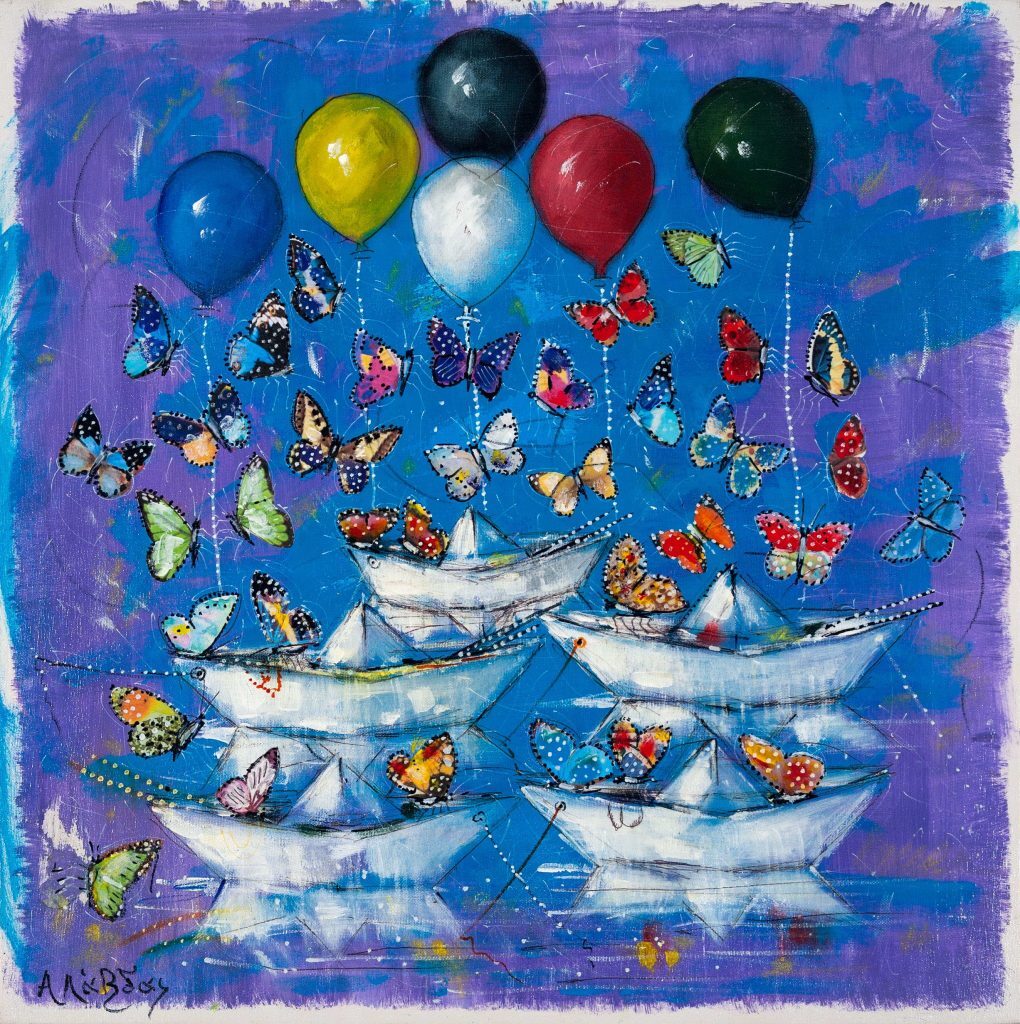 Ο φορέας για την κατάκτηση της πολυπόθητης ελευθερίας είναι οι αέναες πολύχρωμες πτήσεις, που γεμίζουν τους ουρανούς σε μια αδιάκοπη κίνηση προς τα πάνω. Στα έργα του Απόστολου Λάβδα αυτή τη φορά γίνονται πρωταγωνιστές οι πεταλούδες και τα μπαλόνια, σύμβολα δυναμικά σε μια πανδαισία χρωμάτων και ρυθμών. Μοιάζουν να θέλουν να μεταδώσουν το πέταγμα τους και να ανοίξουν δρόμους σε ανοιχτούς ορίζοντες. Μαζί με τα αγαπημένα ποδήλατα και τις βάρκες, που μπαίνουν κι αυτές στο κάδρο, έρχονται να σημειώσουν ότι δεν έχει σημασία το μέσον, αλλά αυτή η ίδια η απόδραση.