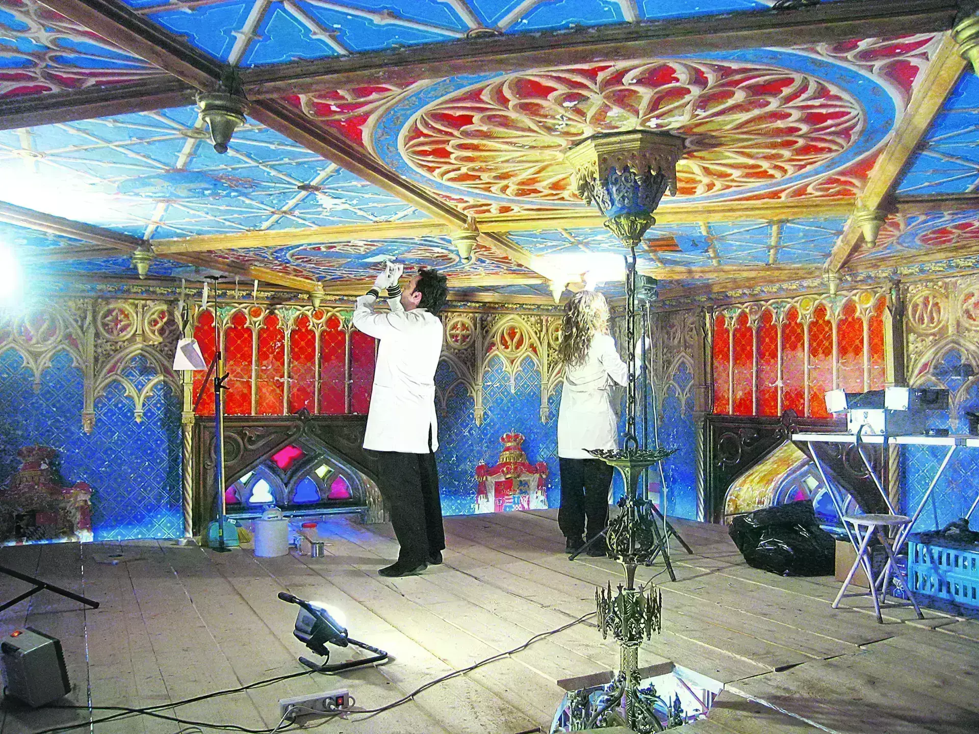 Κάτω, έργα αποκατάστασης του ζωγραφικού διακόσμου της μεγάλη αίθουσας των θυρεών.