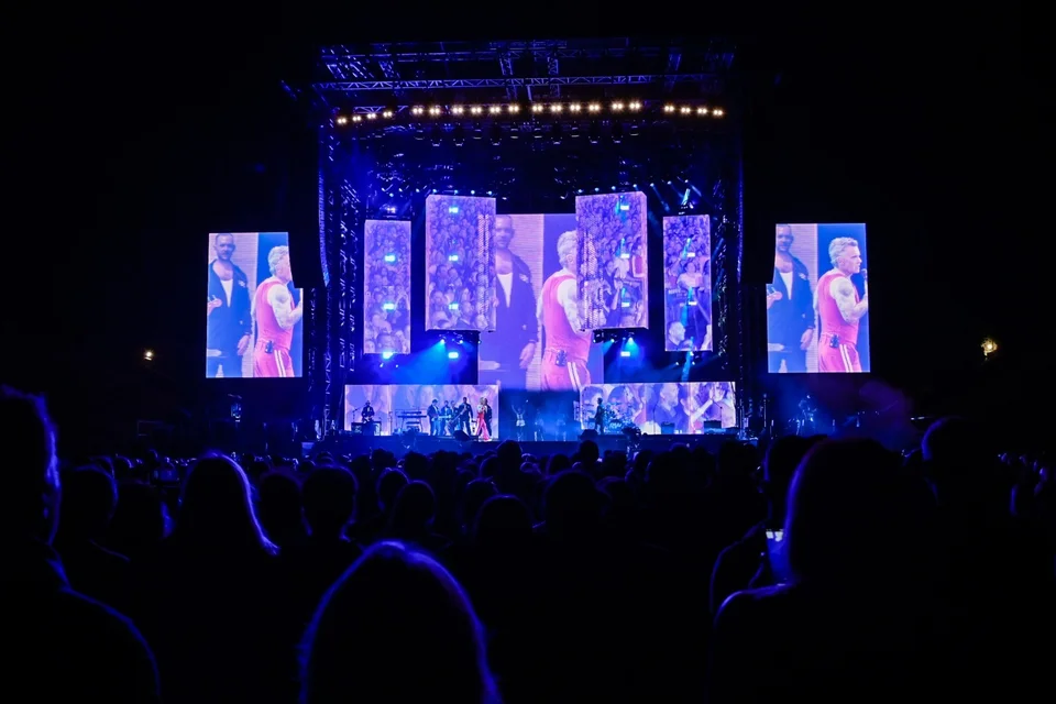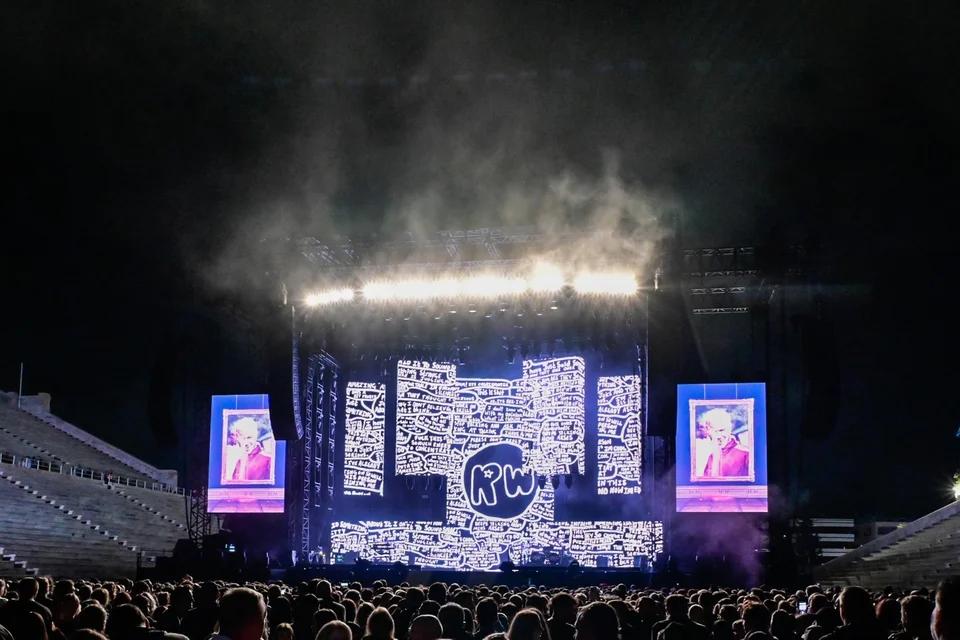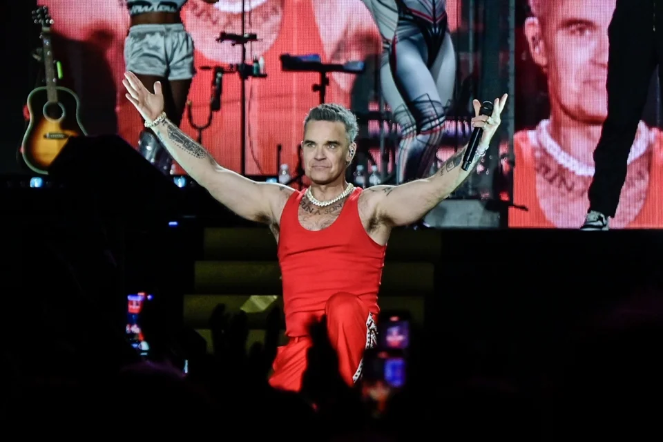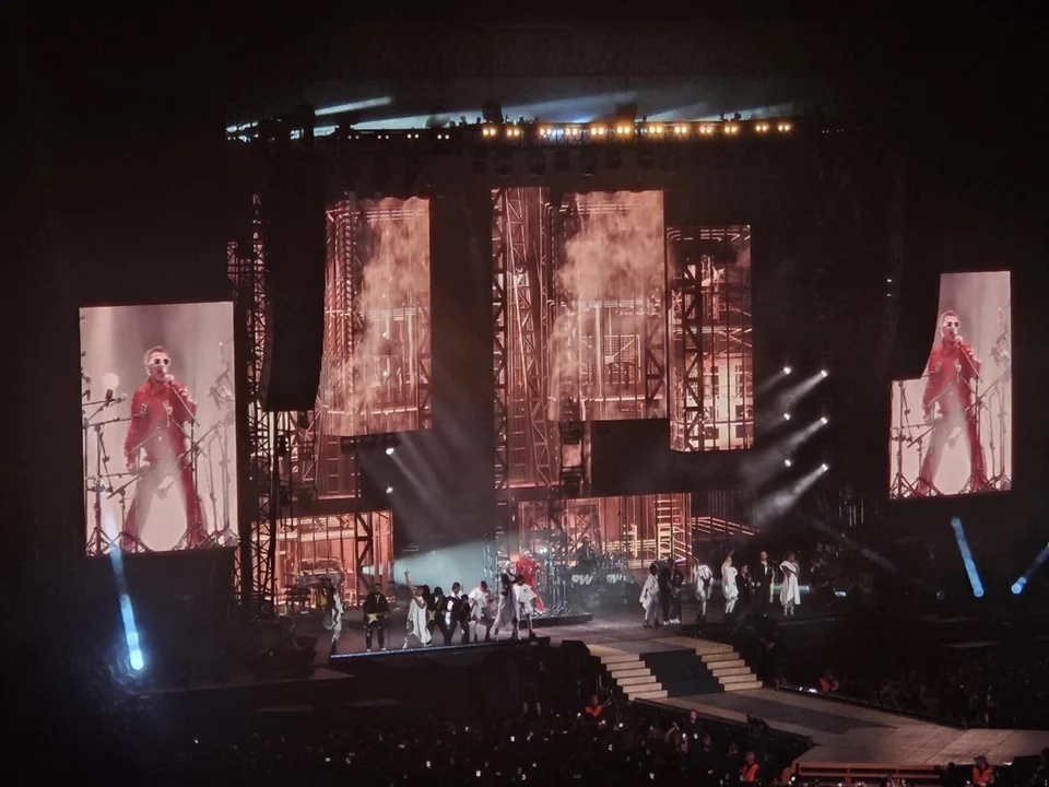 Ο ποπ σταρ, φορώντας κατακόκκινα ρούχα και μεγάλα λευκά γυαλιά, εμφανίστηκε στο στάδιο, ενθουσιάζοντας το κοινό.