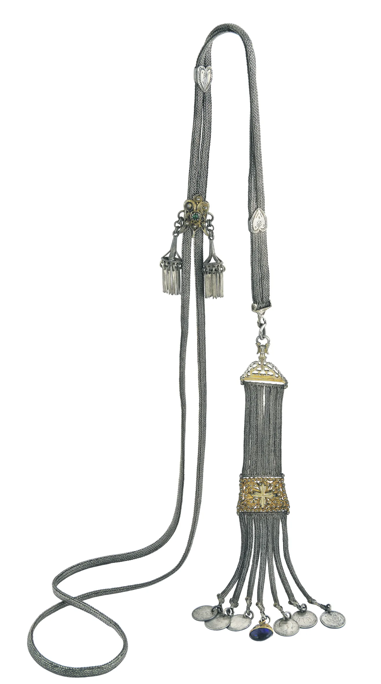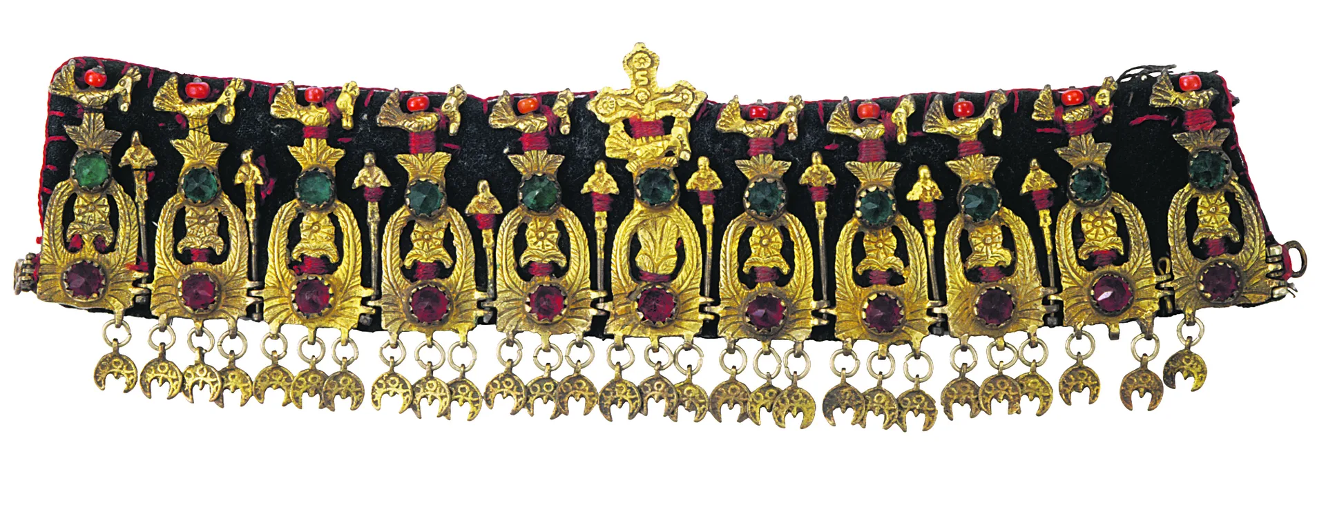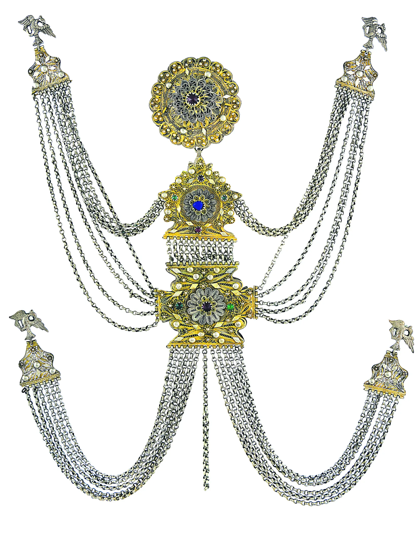 Κι μία «κορόνα», επιμετώπιο νυφικό κόσμημα με χυτά στοιχεία σε σχήμα πουλιού και σταυρό στο κέντρο από το Πωγώνι των Ιωαννίνων. Πολύτιμα τεκμήρια για τη ζωή από τον 18ο έως τις αρχές του 20ού αιώνα αντανακλούν τις ιδιαίτερες ιστορικές, οικονομικές και κοινωνικές συνθήκες που καθόρισαν τη διαμόρφωσή τους και τη χρήση τους.