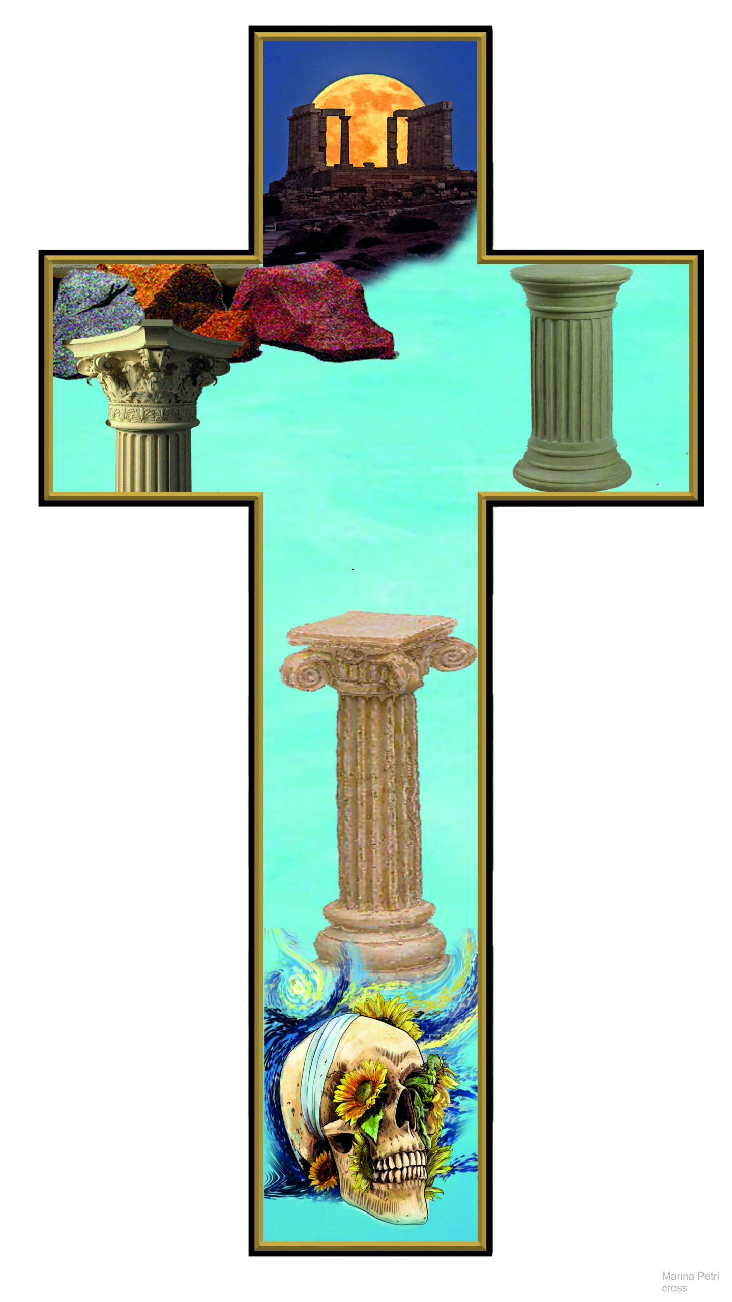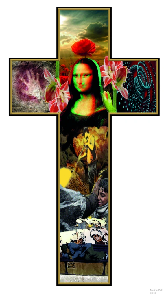 Μαρίνα Πετρή: η δική μου θεματική που αναφέρεται στο γεγονός της Σταύρωσης έχει ένα εύρος εικαστικής ερμηνείας, όπως αναφορά σε κλασικά έργα ή κλασικές συνθέσεις. Αυτές καθορίζουν με την χάραξη και την επιλογή των συμβόλων τους το γνωστό θέμα των Παθών και της Σταύρωσης του Ιησού Χριστού, αφού αυτό το είδος της ποινής ήταν από εκείνα και πολλά μετέπειτα χρόνια στον τότε γνωστό κόσμο σύνηθες και αποτελεσματικό! Για την σταύρωση του σύγχρονου ανθρώπου κάνω αναφορές σε γνωστά είδωλα του πολιτισμού και της τέχνης καθώς και στα έργα τους, όπως την Amy Winehouse, τον Jim Morrison, την Frida Kahlo, τον John Lennon, τον Νίκου Καζατζάκη, τον Picasso και άλλων με αναφορές σε ανάλογα λογοτεχνικά κείμενα γραμμένα στην πίσω αθέατη πλευρά τους. Αυτά τα σύγχρονα είδωλα μαζί με εικόνες των ανελέητων πολέμων και της αθέατης βίας που εξακολουθούμε να βιώνουμε, μετουσιώνονται από το χαρακτηριστικό Pop Art σε vintage digital art έργα. Αυτό γίνεται μέσω ενός Χριστιανικού Σταυρού δύο διαστάσεων (που έχει την μεγαλύτερη έκταση προς τα κάτω, στο κάθετο σκέλος του και μικρότερη στο οριζόντιο) εγκλεισμένου σε plexiglass, έτσι ώστε ο τρόμος να περνά σε δεύτερη μοίρα και να απολαμβάνουμε την εσωτερική τους διαδρομή με την ουσιαστική και μεταφορική έννοια τού «ο καθένας κουβαλάει τον σταυρό του».
