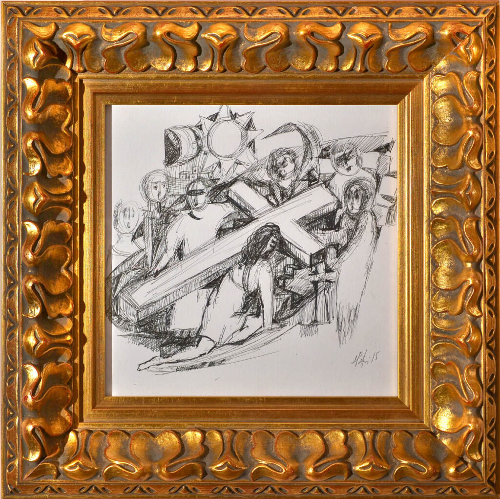 Στο – μικρό σύμφωνα με το ρεαλιστικό μέγεθος του- έργο με μαύρο μελάνι σε χαρτί φαίνεται η σύνθεση του κουβαλήματος του Σταυρού από τον Χριστό και τον κόσμο γύρω του, που περιέχεται σε μια νηόμορφη φόρμα και παραπέμπει μεταφορικά τον θεατή στη λέξη Ναυς – νέω = πλέω, απ’ όπου προέρχεται και η λέξη ναός.