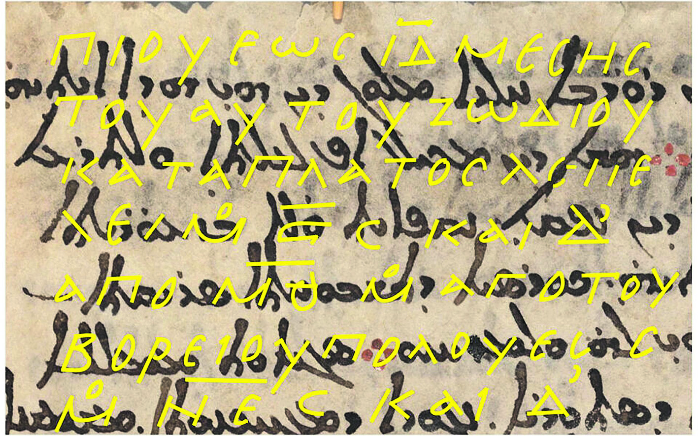 Οι μελετητές κάτω από τα χριστιανικά κείμενα ανακάλυψαν τις ακριβείς συντεταγμένες για τα άστρα στα τέσσερα άκρα του αστερισμού Corona Borealis (Βόρειου Στέφανου), ενώ επίσης ήρθαν στο φως βάσιμες ενδείξεις ότι η πηγή αυτών των μετρήσεων ήταν ο Ιππαρχος, εξαιτίας του ιδιότυπου τρόπου με τον οποίο εκφραζόταν σε κάποια δεδομένα. Το φαινόμενο της μετάπτωσης -κατά το οποίο η Γη ταλαντεύεται αργά στον άξονά της κατά μία μοίρα κάθε 72 χρόνια- σημαίνει ότι η θέση των σταθερών αστεριών μετατοπίζεται αργά στον ουρανό. Οι ερευνητές σύμφωνα με αυτή τη θεωρία κατάφεραν να προσδιορίσουν και να ελέγξουν το πότε ο αρχαίος αστρονόμος έκανε τις παρατηρήσεις του και διαπίστωσαν ότι οι συντεταγμένες ταιριάζουν περίπου στο 129 π.Χ. κατά την περίοδο που ο ίδιος εργαζόταν!