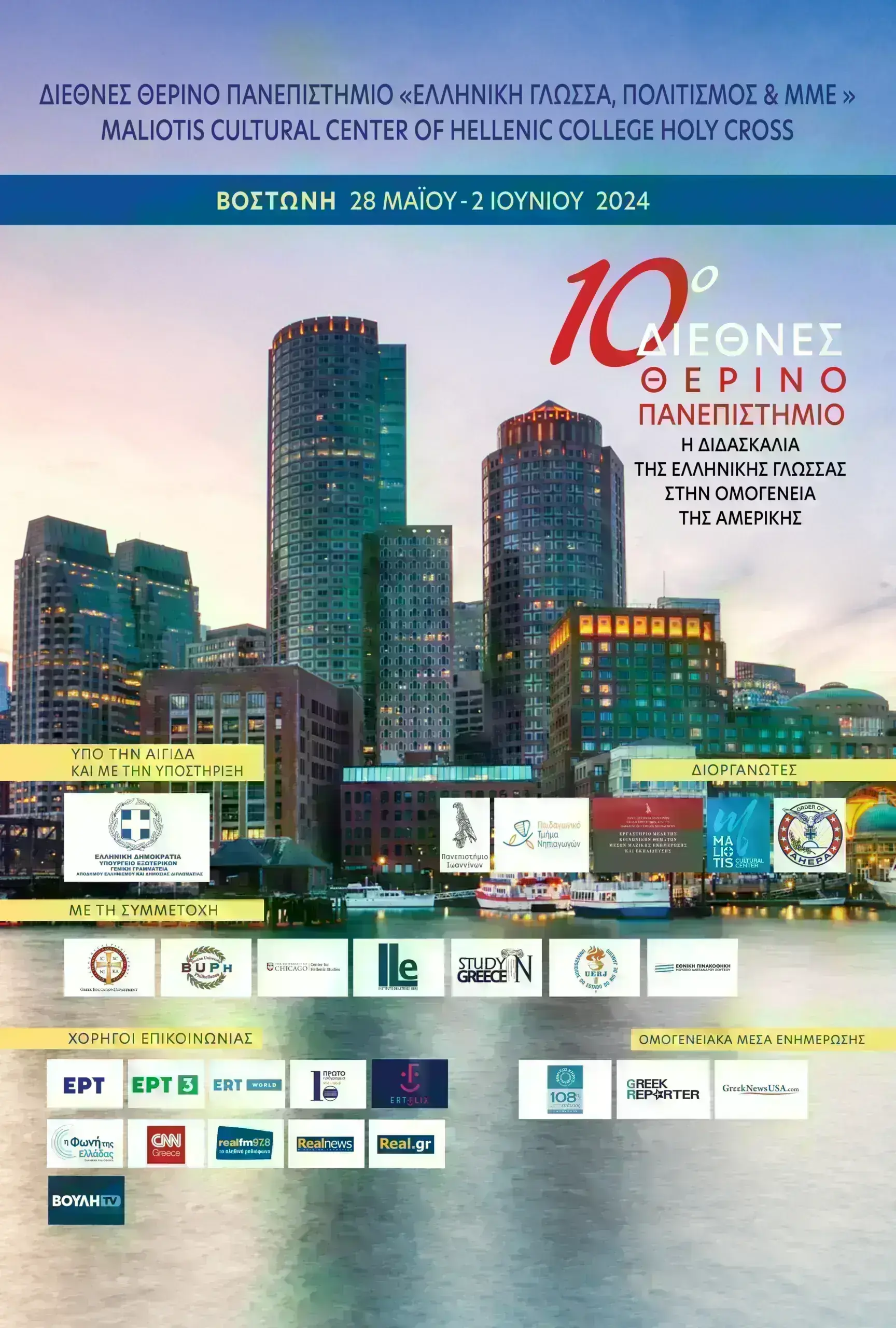 Στο 10ο Διεθνές Θερινό συμμετέχουν το Οικουμενικό Πατριαρχείο, Τμήμα Ελληνικής Παιδείας και η Ελληνορθόδοξη Αρχιεπισκοπή Αμερικής. Τις εργασίες του Διεθνούς Θερινού Πανεπιστημίου θα τιμήσει και θα προσφέρει ομιλία ο Αρχιεπίσκοπος Αμερικής κ.κ. Ελπιδοφόρος. Στο πρόγραμμα συμμετέχουν επίσης οι Boston University Philhellenes της Βοστώνης, το Κέντρο Ελληνικών Σπουδών του University of Chicago, το Instituto de Letras του Rio De Janeiro University, η εταιρεία των ελληνικών Πανεπιστημίων, Study in Greece, αλλά και η Εθνική Πινακοθήκη – Μουσείο Αλέξανδρου Σούτσου. Η επετειακή διοργάνωση θα πραγματοποιηθεί στη Βοστώνη από 28 Μαΐου έως και 2 Ιουνίου 2024, στην αίθουσα πολιτιστικών εκδηλώσεων του Maliotis Cultural Center (Brookline).