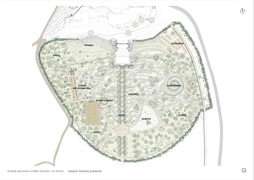 H θέση των Κήπων βρίσκεται νότια του κτιριακού συνόλου του Ανακτόρου και των Μαγειρείων και σε άμεση γειτνίαση με την Πύλη της Λεύκας. Το βορειότερο επίπεδο των Κήπων βρίσκεται στην υψηλότερη στάθμη περιλαμβάνοντας τις διαμορφώσεις που συνδέονται άμεσα με το Ανάκτορο, στο Τατόι. Από τη στάθμη αυτή ξεκινά η διπλή πλατιά μαρμάρινη σκάλα, σε συμμετρική διάταξη, για την πρόσβαση στην κατώτερη στάθμη των Κήπων. Το αμέσως χαμηλότερο επίπεδο που περιλαμβάνει την ελλειψοειδή κρήνη και την κολυμβητική δεξαμενή κατασκευάστηκε τη δεκαετία του 1950. Από τη στάθμη αυτή και κάτω, διαμορφώνεται η κεντρική Αλέα των Κήπων, η οποία έχει σημαντικό ρόλο στη χωρική οργάνωση των Κήπων, ενώ εκατέρωθεν, διαμορφώνονται μονοπάτια διατεταγμένα σε ομόκεντρους κύκλους. Στις θέσεις, όπου διασταυρώνονται οι εγκάρσιες πορείες με την κυκλική διάταξη, προκύπτουν επιμέρους κυκλικοί κόμβοι. Εντοπίζεται κι ένας επιπλέον κόμβος στο κέντρο της σπείρας, ως απόληξη της διαδρομής στον Λαβύρινθο. Κεντρικά και ανατολικά της Αλέας, ο σχεδιασμός υποστηρίζει την λογική του περιπάτου. Στον τομέα, στα δυτικά της Aλέας, χωροθετούνται χρηστικές λειτουργίες όπως το θερμοκήπιο και το γήπεδο τένις.