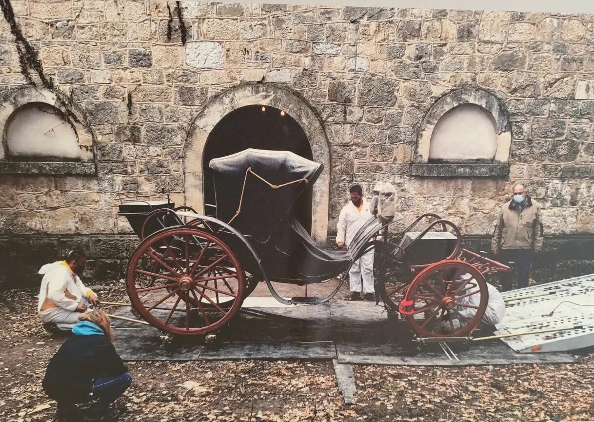 Εντοπίστηκε μαζί με άλλες έντεκα άμαξες στο βάθος του κτιρίου του Στάβλου στο κτήμα Τατοΐου, πίσω από στοίβες αντικειμένων. Σήμερα θεωρείται η σημαντικότερη άμαξα της συλλογής, καθώς υπήρξε η επίσημη άμαξα της βασιλικής οικογένειας. Αγοράστηκε από τον βασιλιά Γεώργιο Α’ περίπου το 1871 και αρχικά ανήκε στον κόμη του Chambord, πρώην δούκα του Μπορντό, γνωστό και ως Ερρίκο Ε’. Πρόκειται για άμαξα τύπου «Berlin», κατασκευασμένη στα εργαστήρια των αδελφών Binder στο Παρίσι. Χρησιμοποιήθηκε σε γαμήλιες και επίσημες εμφανίσεις. Η συντήρησή της περιέλαβε σωστικές επεμβάσεις και ειδική μετακίνηση, ενώ το αποσπώμενο κάθισμα απεντομώθηκε σε περιβάλλον αζώτου και αποκαταστάθηκε με μεταξωτό ύφασμα, και επίπονες χειροποίητες ραφές με μεταξωτή κλωστή.