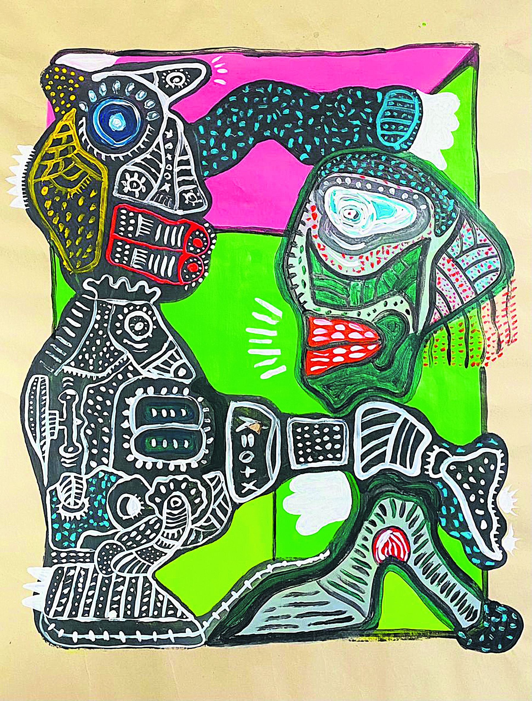 Εντελώς διαφορετική η εικαστική στο ΓΑΚ/Ιστορικό Αρχείο-Μουσείο Υδρας. Τα 30 έργα που παρουσιάζει εκεί τα τοποθετεί στην «Art Brut» περίοδό του, επειδή δημιουργήθηκαν σε 168 ώρες, με σκοπό να ξεπεράσει ο ίδιος την απώλεια του πατέρα του. Οπως αναφέρει, πρόκειται για έργα που αποδεικνύουν τη ζωή που κρύβει μία απώλεια. Μια απώλεια που εξελίσσεται σε πένθος και εξωραΐζεται μέσω της δημιουργίας.