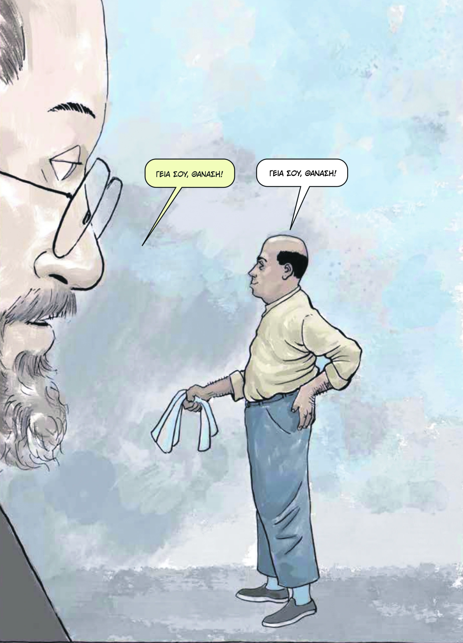 Από την πλευρά του, ο Γιάννης Σολδάτος, στο δικό του επίμετρο, στο τέλος του βιβλίου, συνεχίζει, όπως γράφει, να αναρωτιέται: «Ποιος Θανάσης;». Μία ερώτηση που την υπέβαλε και ο ίδιος στον εαυτό του: «Ποιος είναι ο Θανάσης;». Είναι από τις λίγες περιπτώσεις που αδυνατείς να απαντήσεις με λίγα λόγια, πόσω μάλλον με μία λέξη, όπως ζήτησα από σειρά προσωπικοτήτων, για το ντοκιμαντέρ μου. Οι απαντήσεις ήταν εντυπωσιακές και παράλληλα ανεκδοτολογικές. Θα μπορούσα να πω πως ο Βέγγος είναι το πλήρες όλον, αλλά το αξιακό μας σύστημα ευνοεί την προσωπολατρία, όμως δεν ευνοεί την επιστημονική σαφήνεια. Εκτός όμως από ενδιαφέρουσα ερώτηση, το ποιος Θανάσης είναι και τίτλος ταινίας του, αλλά και ο τίτλος του προλόγου αυτού του βιβλίου. Η πρώτη φράση που διαβάζουμε: Δεν μπορώ να σε πιάσω, ρε Θανάση, που την απευθύνει ο Θανάσης-αφηγητής στον Θανάση-ήρωα του κόμικς. Ο Θανάσης, στο αχαλίνωτο τρέξιμό του, ξεπέρασε ακόμα και τον Βέγγο. Οταν του έλεγα τρέχω σαν τον Βέγγο, μου απαντούσε: Εγώ τρέχω περισσότερο και από τον Βέγγο και με άφηνε πίσω».