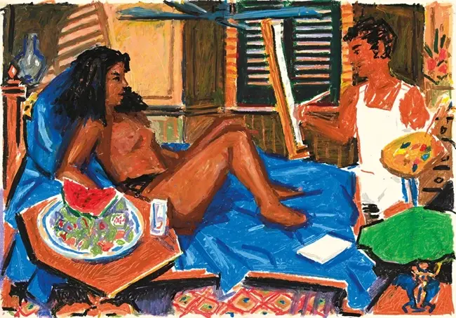 Ο κόσμος του, χαοτικός, οργιώδης, ερωτικός και σκανταλιάρικος μα πρωτίστως βαθιά ανθρώπινος. Στο έργο του συνυπάρχουν μεγάλοι ζωγράφοι από την Ιστορία της Τέχνης με κυρίαρχη φιγούρα αυτή του Lautrec, ζευγάρια που ερωτοτροπούν, conquistadors, Κένταυροι, λουόμενοι, θαμώνες των Αμερικανικών dive bars, ο Δον Κιχώτης.