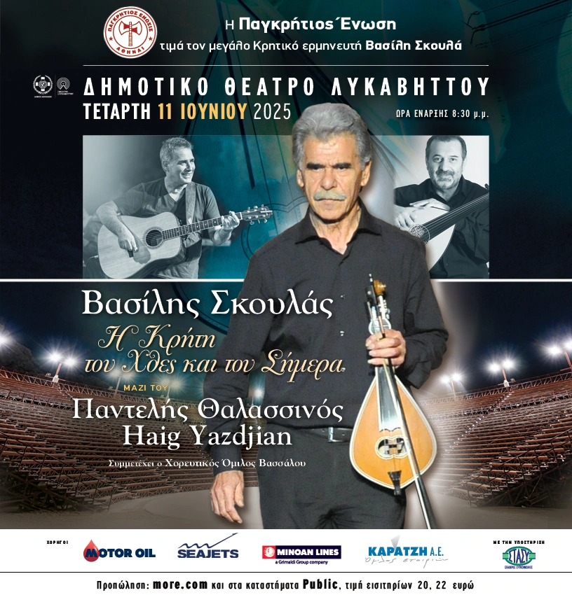 Ο θρυλικός λυράρης και ερμηνευτής, ιδιαίτερη μορφή και κορυφαία μουσική φυσιογνωμία, σύμβολο των απανταχού Κρητών, ο Βασίλης Σκουλάς από τα Ανώγεια της Κρήτης, μέγεθος αυθεντικό, σαν τον βράχο του Ψηλορείτη, σεμνός και λαοφιλής, θα ενώσει θα δώσει στις 11 Ιουνίου στον Λυκαβηττό, το νήμα από το ριζίτικο τραγούδι και την παραδοσιακή μουσική έως τις μεγάλες του επιτυχίες.