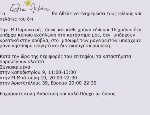 Το εστιατόριο πάντως στην επίσημη σελίδα του στο Facebook ανακοίνωσε ότι ανήμερα της Μεγάλη Παρασκευής δεν θα σερβίρει κρέας παρά μόνο νηστίσιμα πιάτα, ενώ σημείωσε ότι το κατάστημα θα παραμείνει κλειστό κατά την περιφορά του Επιταφίου.