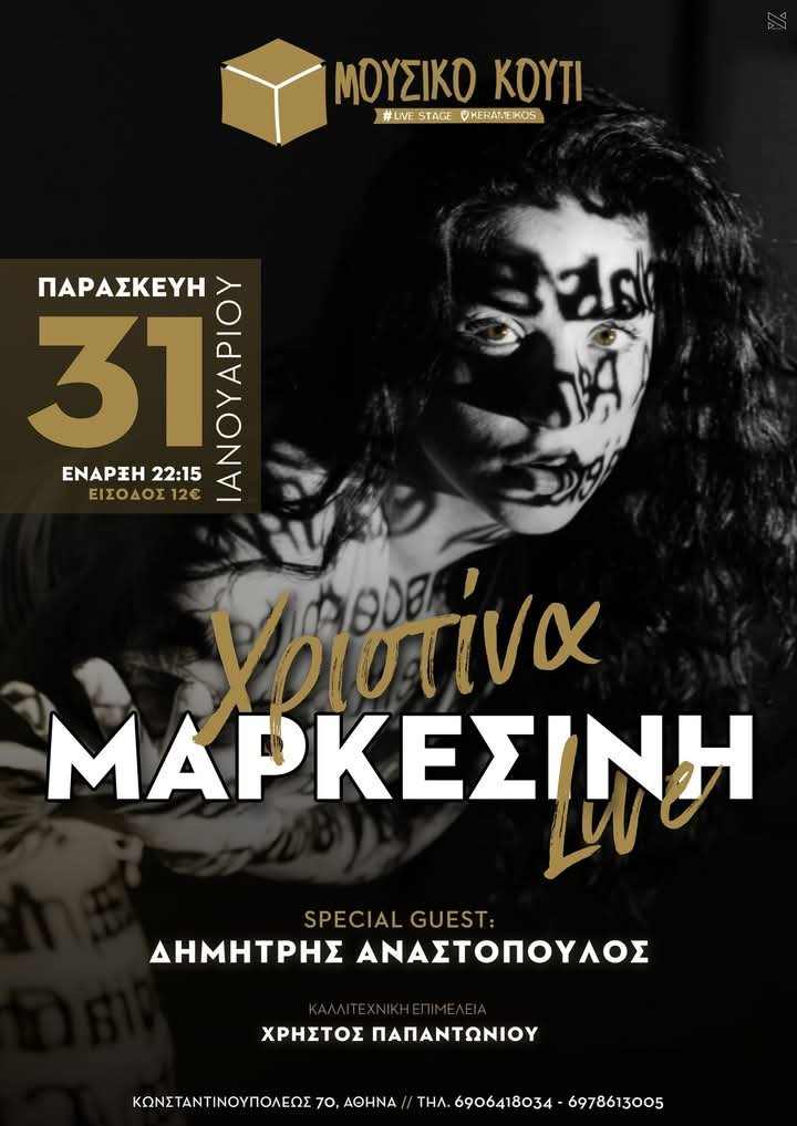 Σε αυτό το Live η Χριστίνα Μαρκεσίνη θα μας παρουσιάσει και το νέο της single “Σαν αποτσίγαρα” που θα κυκλοφορήσει τον Φεβρουάριο σε μουσική και στίχους του Γιώργου Κομνά.