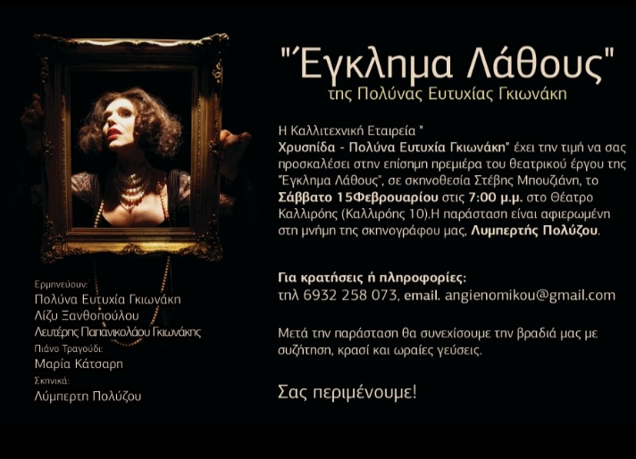 Η επίσημη πρεμιέρα θα γίνει αύριο στις επτά το απόγευμα στο θέατρο Καλλιρόης και η παράσταση είναι αφιερωμένη στην μνήμη της σκηνογράφου Λυμπερτής Πολύζου.