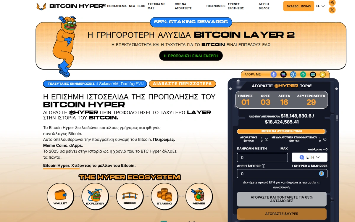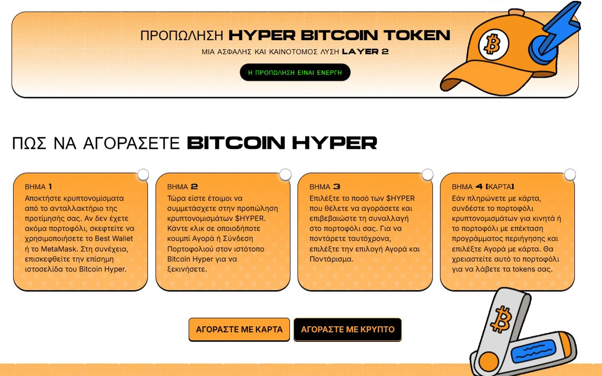 Η προπώληση του Bitcoin Hyper μπορεί να φτάσει τα 19 εκατομμύρια δολάρια ακόμη και μέσα στην επόμενη εβδομάδα, ίσως και νωρίτερα. Αν θέλετε να συμμετάσχετε και να αποκτήσετε HYPER πριν ανέβει η τιμή, επισκεφθείτε την επίσημη σελίδα του Bitcoin Hyper, όπου μπορείτε να αγοράσετε tokens με SOL, ETH, USDT, USDC, BNB ή ακόμη και με πιστωτική κάρτα.