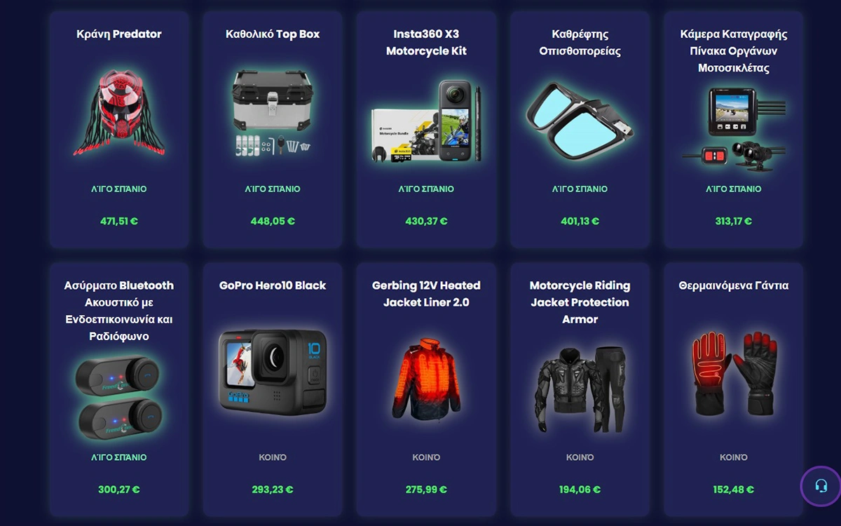 - Κάμερες και Action gear: GoPro Hero10, Insta360, κάμερες καταγραφής διαδρομής και πλήρη moto kit.