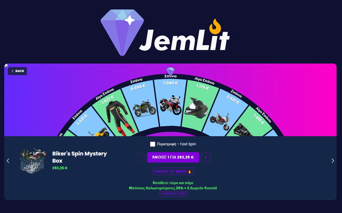 Το Biker’s Spin Mystery Box του Jemlit είναι μια εμπειρία γεμάτη αγωνία, τύχη και πάθος για τη μηχανή. Κάθε κουτί κρύβει μια διαφορετική ιστορία, με αντικείμενα που συνδυάζουν στυλ και χρήσιμα δώρα, όπως, δερμάτινα αξεσουάρ, gadgets ακόμα και premium εξοπλισμό.