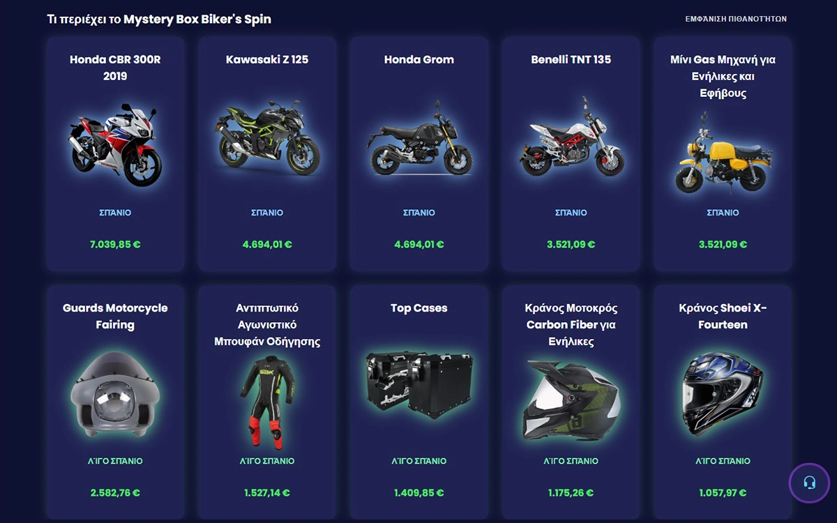 Το συγκεκριμένο Mystery Box δεν προσφέρει μπρελόκ ή απλά gadget, αλλά κορυφαίο εξοπλισμό, πραγματικές μηχανές και premium gear που συναντά κανείς μόνο σε εξειδικευμένα καταστήματα. Εδώ, το unboxing μπορεί να σας φέρει από κράνος SHARK έως μια μηχανή Honda CBR.