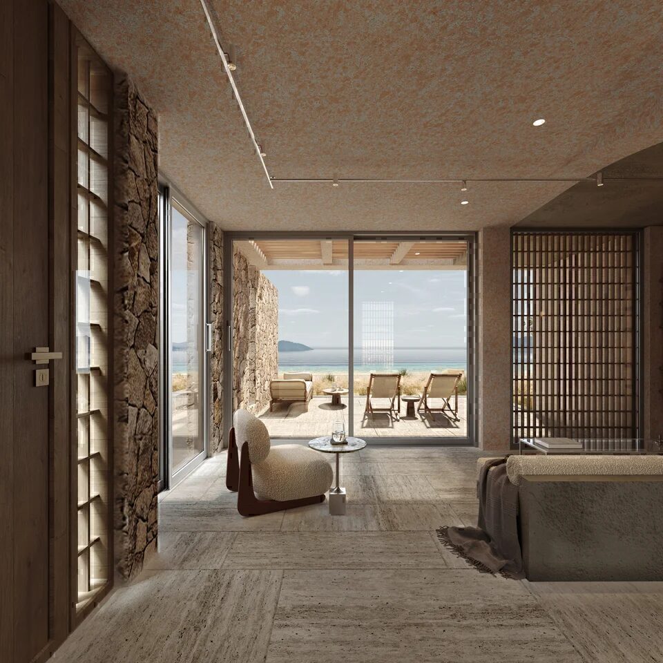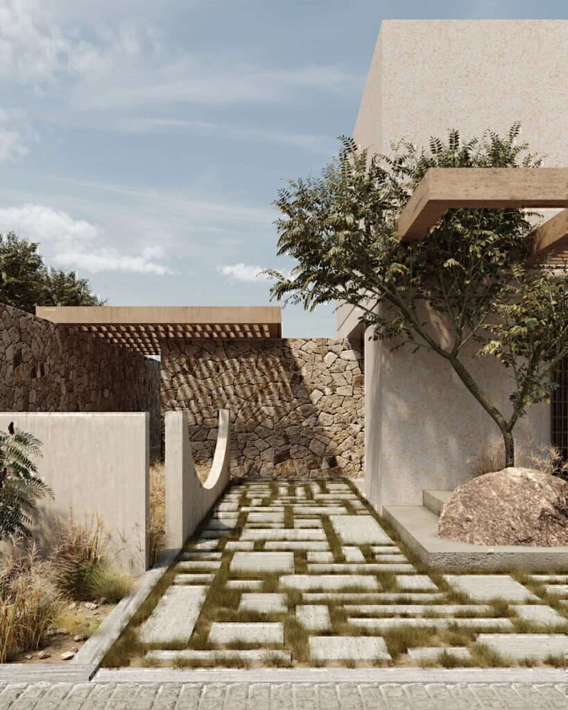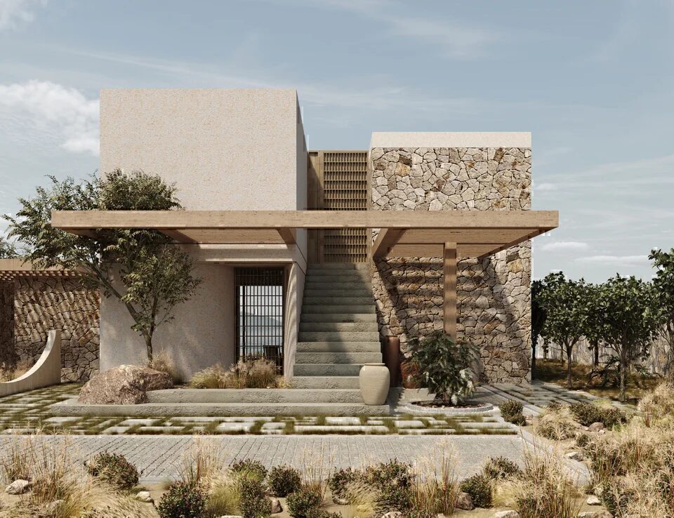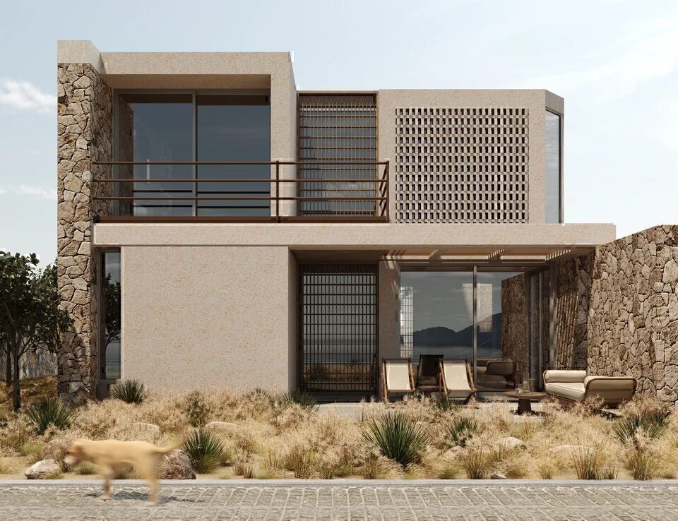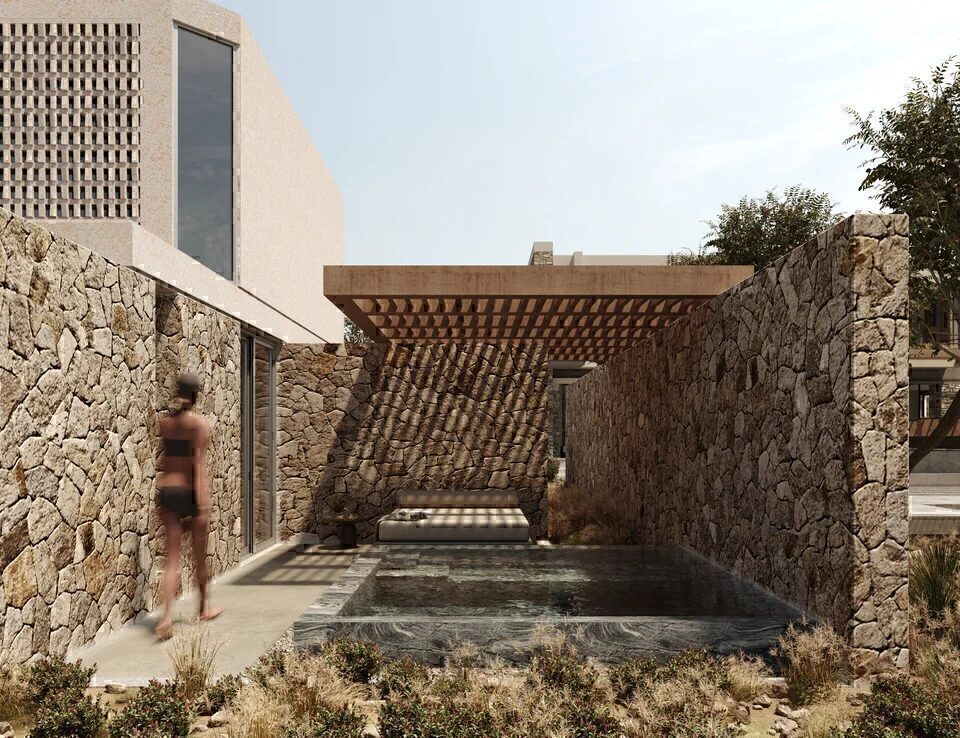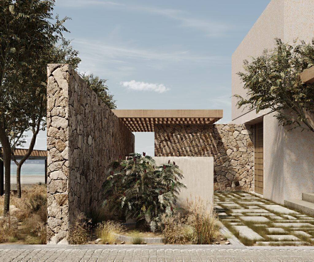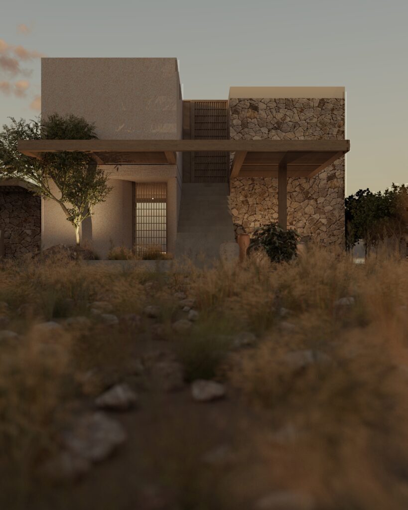 Ο άγριος λευκός σοβάς αποκτά έναν ιδιαίτερο χαρακτήρα μέσα από τον εμπλουτισμό του με χρωματιστά αδρανή. Οι τοίχοι παύουν να είναι απλά στοιχεία πλήρωσης και στήριξης, αλλά συμμετέχουν ενεργά στην απόδοση χρώματος και «συναισθήματος» στο σύνολο της σύνθεσης. Το χρώμα τους αλλάζει μέσα στη μέρα ανάλογα με τη θέση του ηλίου και τη γωνία θέασης. Η πέτρα γεννά τα περιμετρικά τοιχεία της κατοικίας και δρα ως υλικό προστασίας από τα βλέμματα και τους ανέμους. Η ήσυχη και προστατευμένη από πέτρινους τοίχους και πέργκολα αυλή που αντικρίζει τη θάλασσα και ολοκληρώνεται με την παρουσία του υδάτινου στοιχείου αποτελεί το επιστέγασμα του κύριου νοήματος της σύνθεσης αυτής: αίσθημα ηρεμίας και ένωσης με τη φύση.