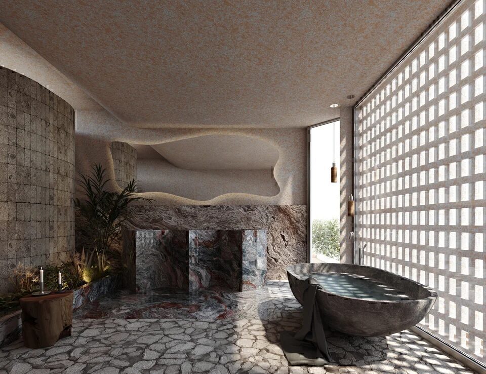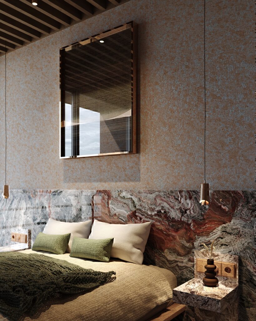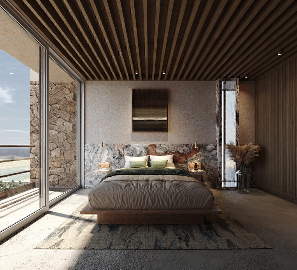 Το εσωτερικό της κατοικίας χαρακτηρίζεται περισσότερο από την απουσία του υπερ-σχεδιασμού. Κυριαρχεί η απλότητα και το αίσθημα οπτικής τάξης και «ησυχίας». Οι σκάλες αποτελούν τα μοναδικά στοιχεία γεωμετρίας που αναδεικνύονται σκόπιμα προκειμένου να προσδώσουν πλαστικότητα στο εσωτερικό. Η επίπλωση είναι στοιχειώδης, επιτρέποντας στο φυσικό περιβάλλον που περιβάλλει την κατοικία να «εισβάλλει» στο χώρο και να λειτουργεί ως οι κύριος πρωταγωνιστής. Το υπνοδωμάτιο και το μπάνιο αυτού αποτελούν τους μοναδικούς χώρους όπου το interior design της κατοικίας γίνεται εκφραστικό και αναδεικνύει τεχνικές χειροτεχνίας με κύριο αντικείμενο το μάρμαρο Salome με προέλευση από την Τουρκία. Το ξύλο συμπληρώνει τη θερμή και αδρή παλέτα υλικών των ιδιωτικών χώρων. Το αποτέλεσμα είναι ένα παιχνίδι προοπτικής, γεωμετρίας και διαφοροποίησης υφών που προσθέτει χαρακτήρα και μια υπόνοια παιχνιδίσματος, παράλληλα με ένα ασυνήθιστο αίσθημα οικειότητας, ένα αίσθημα σπιτιού. Η επικάλυψη των δαπέδων από τραβερτίνη με διασταυρούμενους αρμούς επαναφέρει την έννοια της ανάμειξης και ταιριάσματος της υψηλής υλικότητας με παραδοσιακές τεχνικές δόμησης και φινιρισμάτων.
