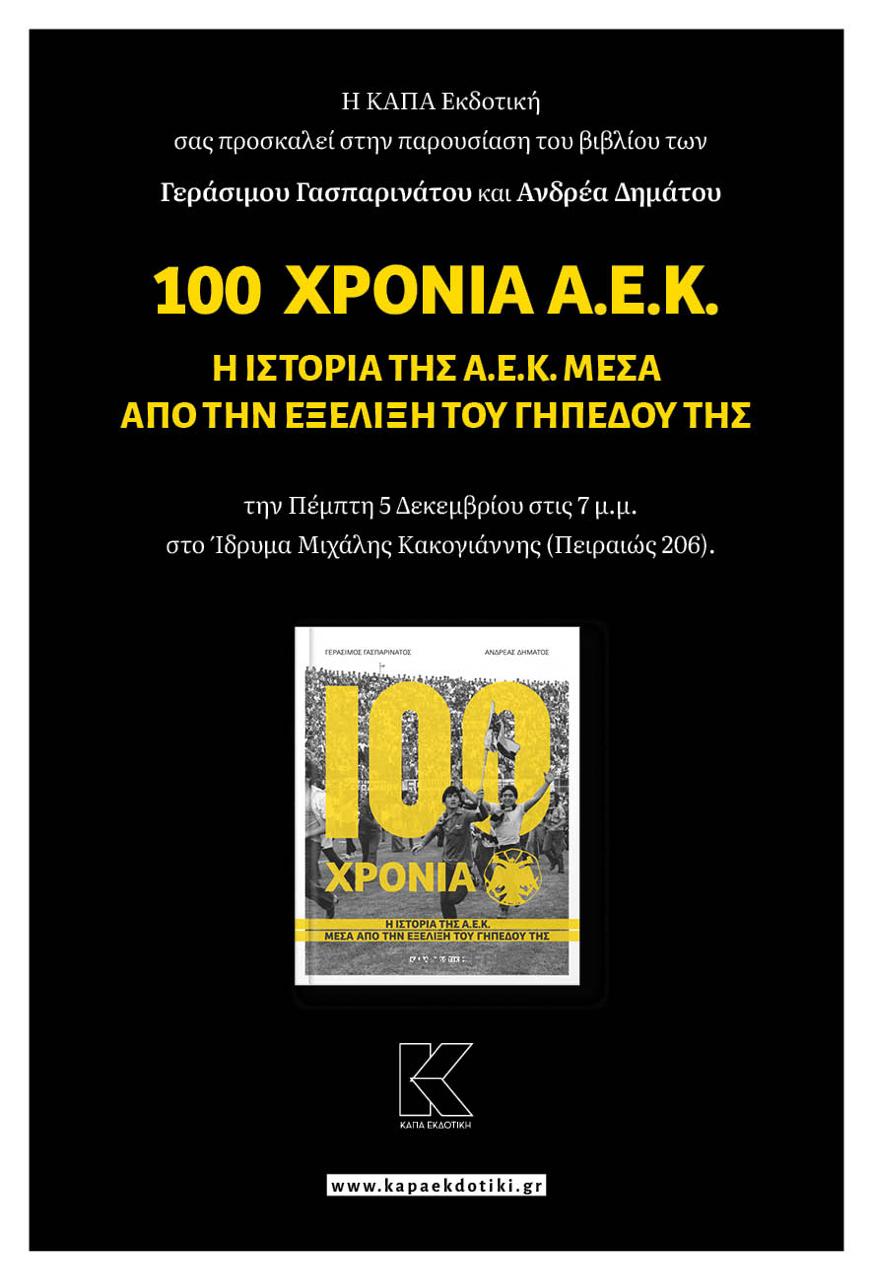100 ΧΡΟΝΙΑ ΑΕΚ: Η ιστορία του συλλόγου μέσα από την εξέλιξη του γηπέδου στη Νέα Φιλαδέλφεια. Μία συλλεκτική έκδοση-λεύκωμα 380 σελίδων με σπάνιο αρχειακό υλικό από τις αρχές του προηγούμενου αιώνα, που εκδίδεται από την Κάπα Εκδοτική.