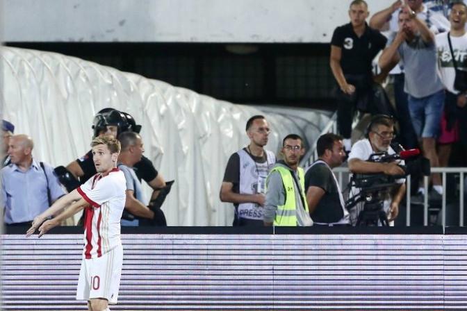 Τραγικές συμπεριφορές στο γήπεδο της Παρτιζάν και κίνδυνος νέας σοβαρής τιμωρίας των Σέρβων. Ο Μάριν δέχθηκε αντικείμενα από την κερκίδα όταν πήγε να χτυπήσει ένα κόρνερ ενώ το ίδιο έγινε με τον Γερμανό, τον Σιώπη και τον Κούτρη μετά το πέρας του α’ μέρους.