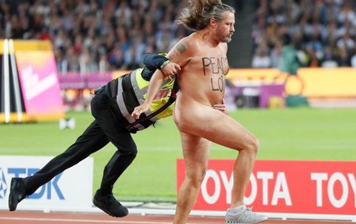 Στη θέα του γυμνού άνδρα, ο οποίος είχε γραμμένες στο στήθος τους τις λέξεις ειρήνη και αγάπη, οι άνδρες της ασφαλείας του σταδίου άρχισαν να τρέχουν μέχρι τελικά να τον ακινητοποιήσουν.