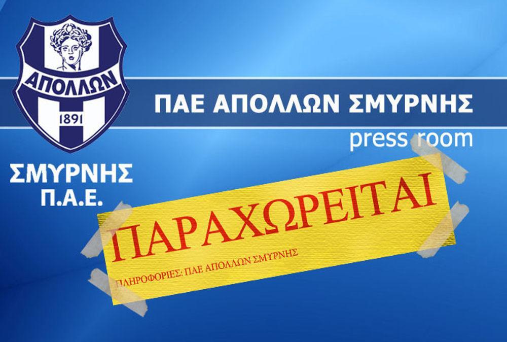 Η ΠΑΕ Απόλλων Σμύρνης ενημερώνει ότι οι μετοχές της ΠΑΕ είναι υπό παραχώρηση και καλεί κάθε ενδιαφερόμενο να επικοινωνήσει για λεπτομέρειες με τα γραφεία της (Λ. Κηφισίας 64Β, 15125 Μαρούσι, 210-6300233).