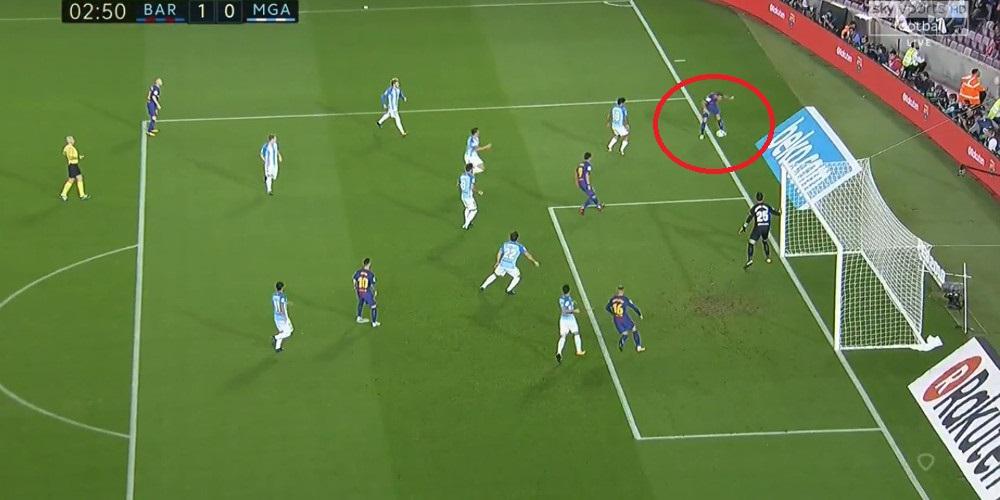 Δύο λεπτά, λοιπόν, μετά την έναρξη του αγώνα στο «Καμπ Νου», η μπάλα πέρασε πεντακάθαρα έξω, πριν σεντράρει ο Λούκας Ντιν και οι παίκτες της Μάλαγα σταμάτησαν, ο διαιτητής ωστόσο, δεν έδωσε άουτ, με τον Ντεουλοφέου να ανοίγει το σκορ!