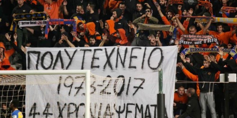 Στο ντέρμπι της Κύπρου κόντρα στην Ομόνοια, όπου το ΑΠΟΕΛ επικράτησε με 3-1, οι οπαδοί των νικητών φρόντισαν να προκαλέσουν με το πανό που σήκωσαν και το οποίο έγραφε: «ΠΟΛΥΤΕΧΝΕΙΟ. 1973-2017. 44 ΧΡΟΝΙΑ ΨΕΜΑΤΑ».