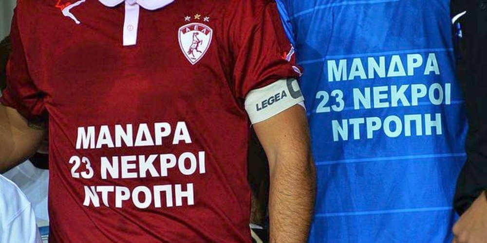 Οι βυσσινί εμφανίσεις των παικτών της θεσσαλικής ομάδας έφεραν στο κυρίως μπροστινό μέρος μήνυμα με το περιεχόμενο “Μάνδρα, 23 νεκροί, ντροπή” στη μνήμη των θυμάτων της φονικής πλημμύρας στη Δυτική Αττική.