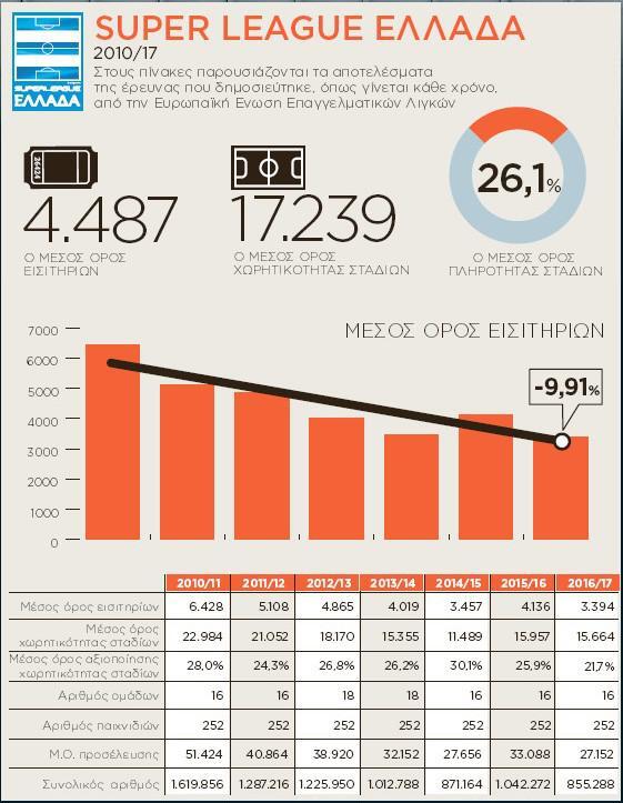 Ειδικότερα στα 16 ελληνικά γήπεδα που έγιναν αγώνες την αγωνιστική περίοδο 2016/17, ο μέσος όρος χωρητικότητας ήταν 15.664 θεατές και η πληρότητα άγγιξε μόλις το 21,7%. Στους 252 αγώνες που έγιναν πέρυσι, κόπηκαν συνολικά 855.288 εισιτήρια και ο μέσος όρος ανά αγωνιστική ήταν 27.152 θεατές.