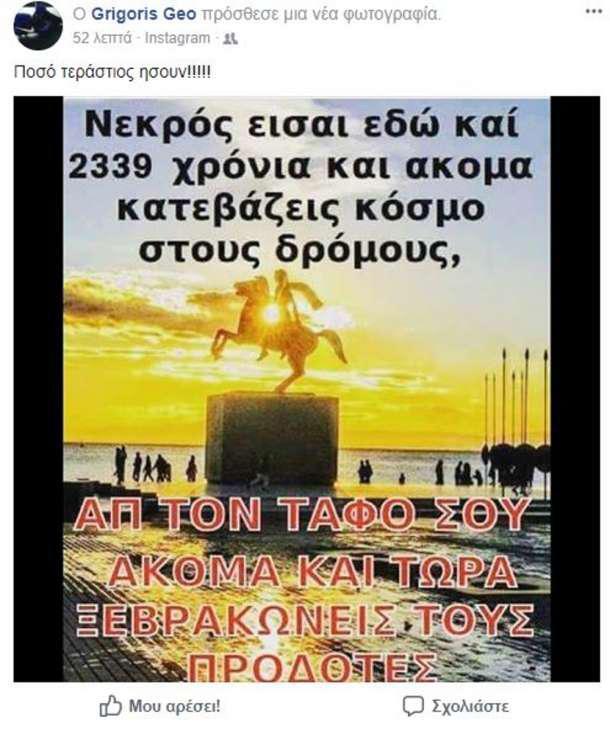 Ποστάροντας μια φωτογραφία με το άγαλμα του Μέγα Αλέξανδρου, έγραψε: «Νεκρός είσαι εδώ και 2339 χρόνια και ακόμα κατεβάζεις κόσμο στους δρόμους. Από τον τάφο σου ακόμα και τώρα ξεβρακώνεις τους προδότες».