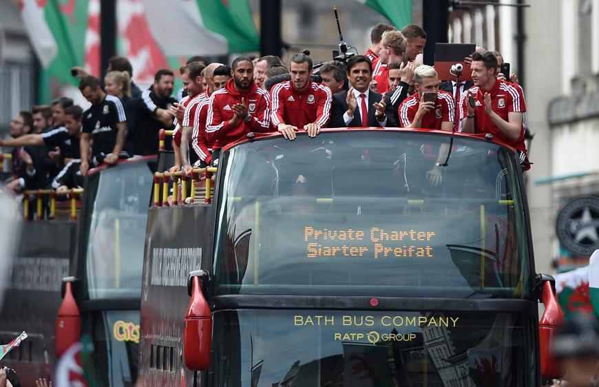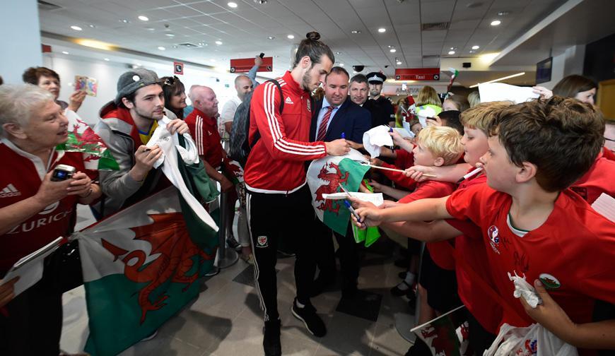 Εκατοντάδες φίλαθλοι που ανέμιζαν σημαίες ζητωκραύγαζαν στην αίθουσα αφίξεων τους Ουαλούς διεθνείς, οι οποίοι σταμάτησαν για να υπογράψουν αυτόγραφα και να… ποζάρουν για “selfies”, προτού επιβιβαστούν σε ανοιχτό λεωφορείο για να κάνουν το γύρο της πόλης.